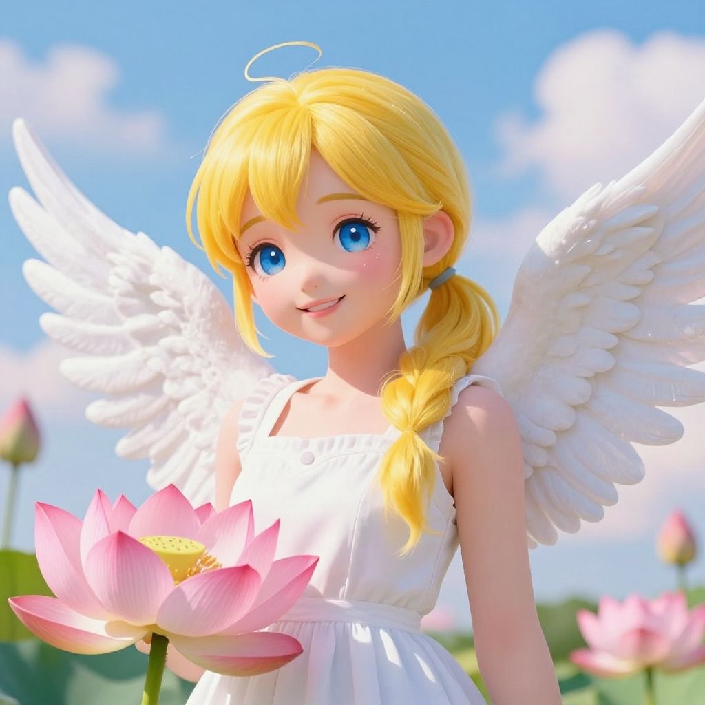 Light, cute, masterpiece, best quality, 8K, (photorealistic:1.4), (Vivid colors:1.3), (content expression:1.3), god. wings., smile, yellow hair, blue eye, white dress, ponytail, forehead, lip, beautiful, close up body, pink, soft, pink lotus, sky, noon, cloud, spring, glitter, smart.long