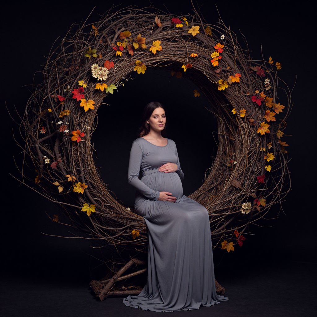 Pregnant woman in a long, gray dress sits on a stool, surrounded by a circular, autumn-themed twig wreath, against a black background