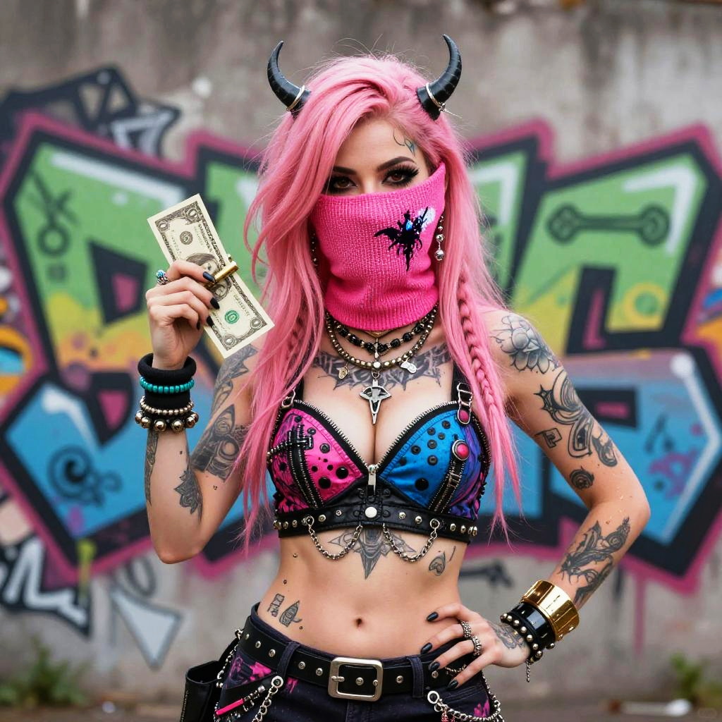 Realistic photo.A cartoon caricature, vibrant pink hair female with brown eyes revealing extra large cleavage, and money dollar bills, multicolored pink blue gothic punk steam punk emo exotic classy gangster outfit, gangster pose, original graffiti tech touch, balaclava, muscle. realistic photo