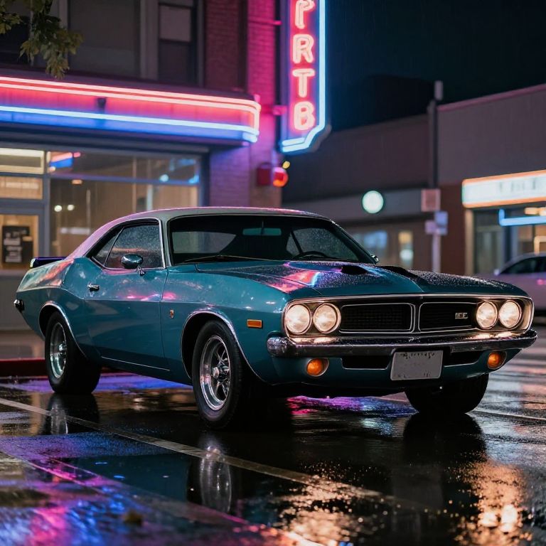 75 Dodge Challenger in a retro 1975 muscle car style, parked under neon lights on a rainy city street at night, reflections on wet pavement, detailed chrome accents and aggressive front grille, cinematic lighting, vintage vibes