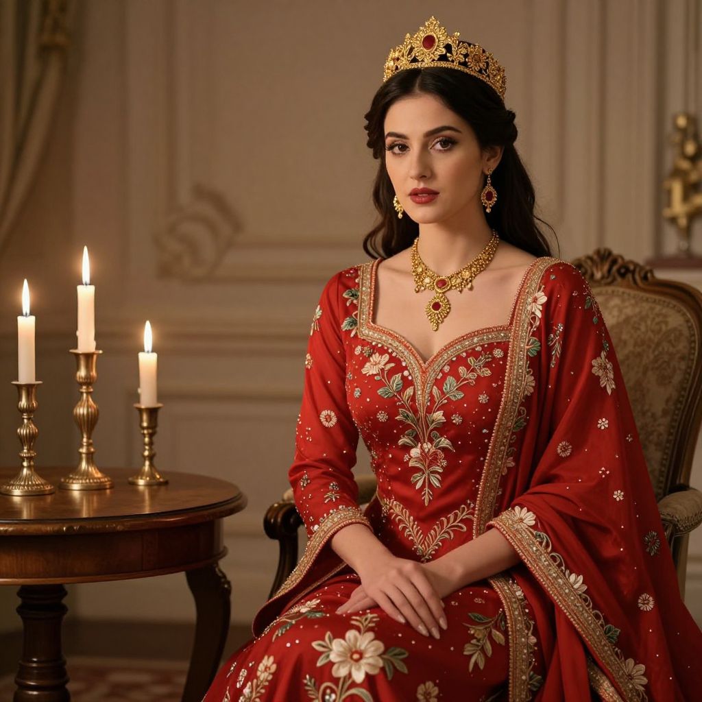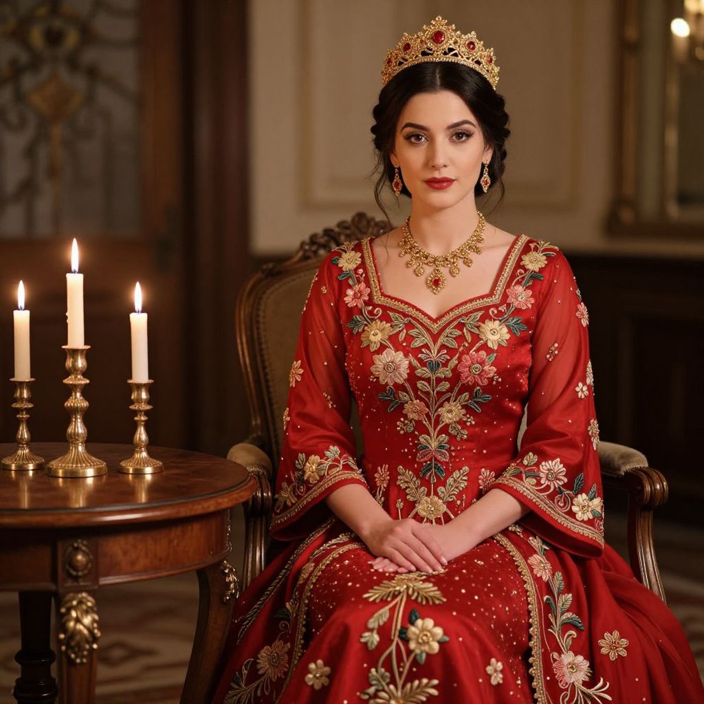 Elegantly dressed woman seated in a luxurious setting, adorned in a vibrant red gown embellished with intricate floral embroidery, complemented by a golden tiara and necklace, with three lit candles casting warm light on a polished wooden table to her left.