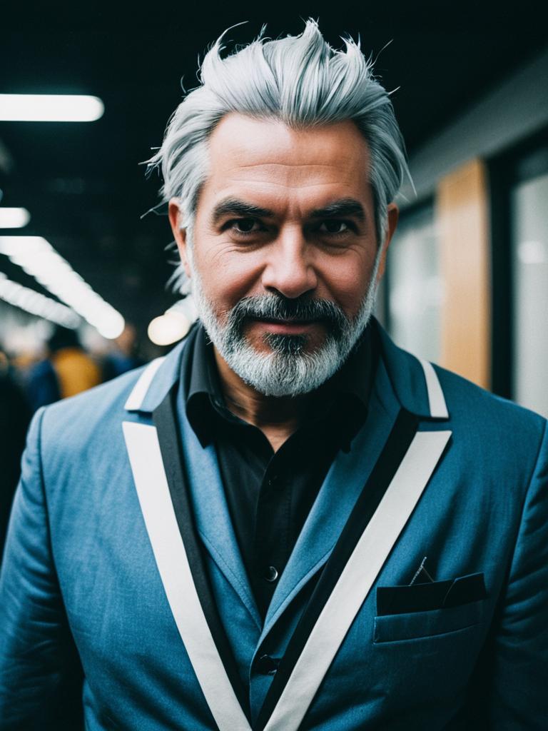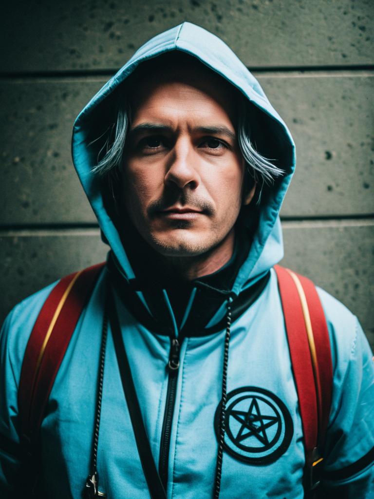 Close-up portrait of a man wearing a light blue hoodie with a pentagram symbol in cosplay style, featuring a red backpack. The man has medium skin tone with dark hair showing grey streaks, standing against a concrete wall background.