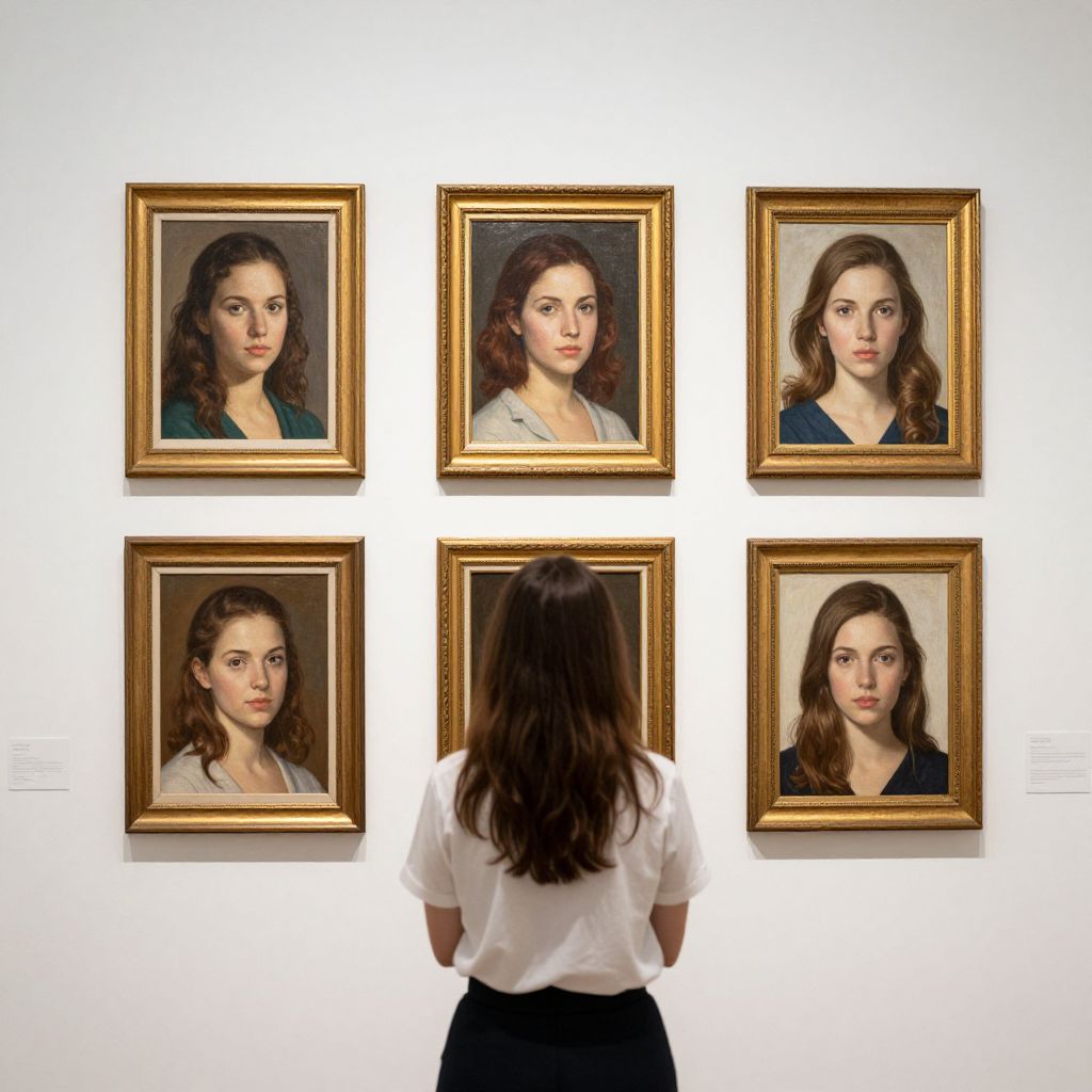 Photograph of a gallery wall displaying six framed portraits of women with similar features. The portraits, all in ornate golden frames, show five women with dark brown, wavy hair and one with lighter brown, wavy hair. They wear dark-colored tops. A woman with long brown hair, wearing a white blouse and black skirt, stands with her back to the camera, observing the portraits. The white wall background accentuates the portraits and the woman's figure. The lighting is even, highlighting the subjects' faces and expressions. The image has a realistic, modern photographic style.