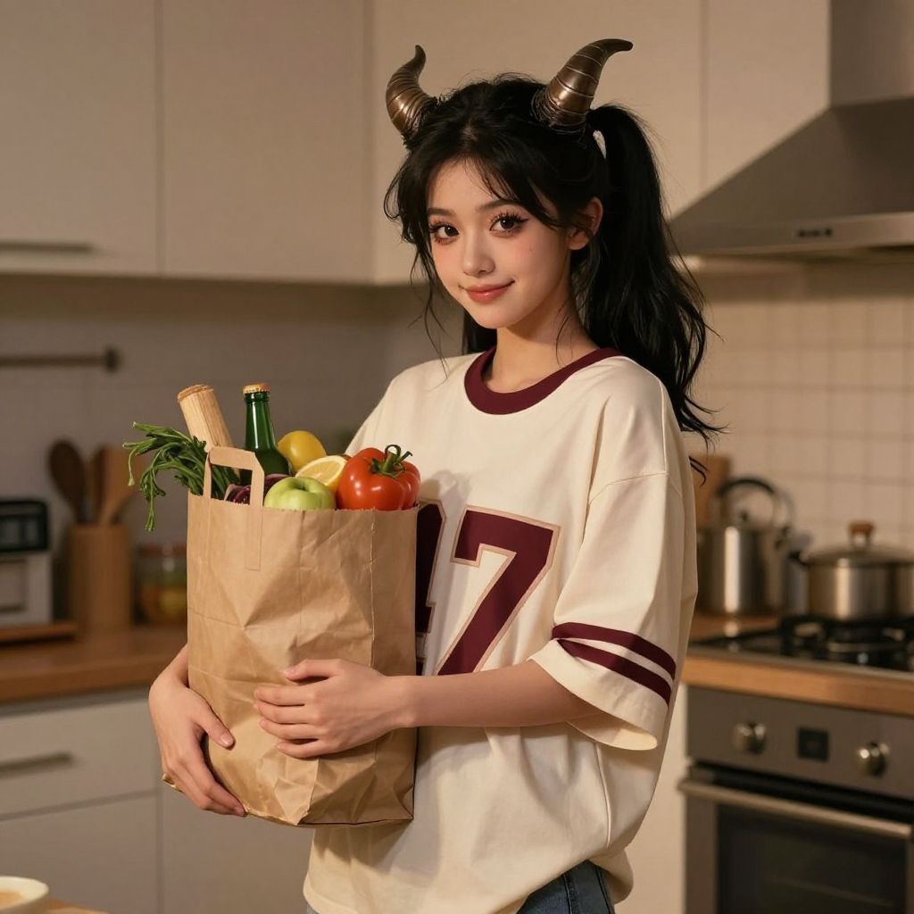 Masterpiece, (7:00 pm) overcast, dusk, amber glow, Rembrandt lighting, photorealistic, sharp focus, from a standing position, 1girl, 26-year-old succubus, (cute: 1.5) (petite: 1.3), black hair, (bushy ponytail: 1.3), (small horns: 1.3), (tiny body: 1.5) (160cm height: 1.5) (small breasts: 1.5) With Thick Eyelashes, small mouth, (realistic skin texture: 1.5), dark hazel eyes, (extremely delicate: 1.3), in the kitchen, with a (brown paper bag) of groceries, wearing a (large, oversized, boxy (cream-colored jersey-style t-shirt: 1.5) with a (burgundy stripe encircling the sleeves) and a (number 47 ) on the front) withjeans. (gentle, happy smile)