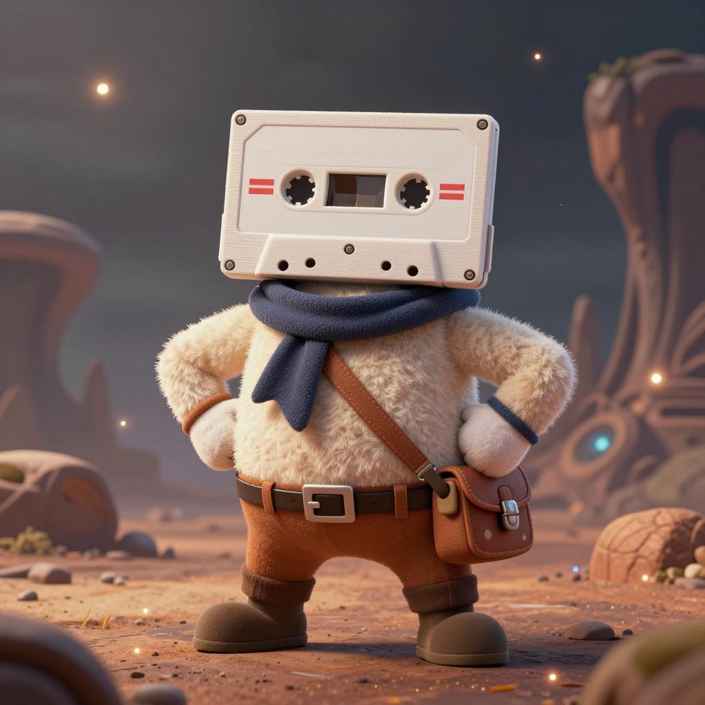 Anthropomorphic cassette tape DJ character with soft plush stuffing with fuzzy texture body, explorer scarf and satchel, mischievous smirk expression, pointing dramatically toward the distance in lush jungle clearing with oversized plants and vines, under warm indoor lamplight with cozy glow, Pixar-style 3D animation, highly detailed, dynamic composition, 8k render