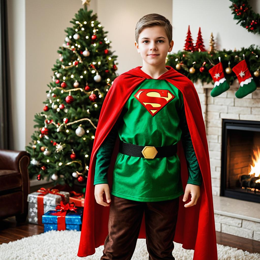 Young boy wearing a green Superman-themed shirt with a red cape and black belt, standing indoors near a decorated Christmas tree. The background includes wrapped gifts, a lit fireplace with stockings, and holiday decorations, creating a festive Christmas atmosphere. The boy has short light brown hair and is dressed in brown pants under long sleeves.