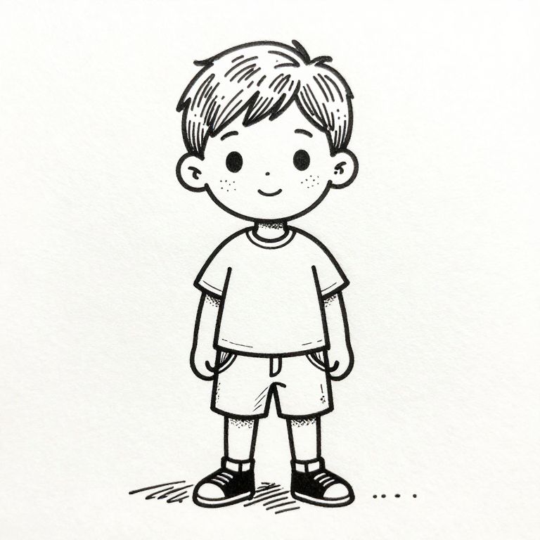 Alegria A portrait of a cute boy, full-body, black ink, line draw, pen drawing, vibrant, minimalist, abstract,