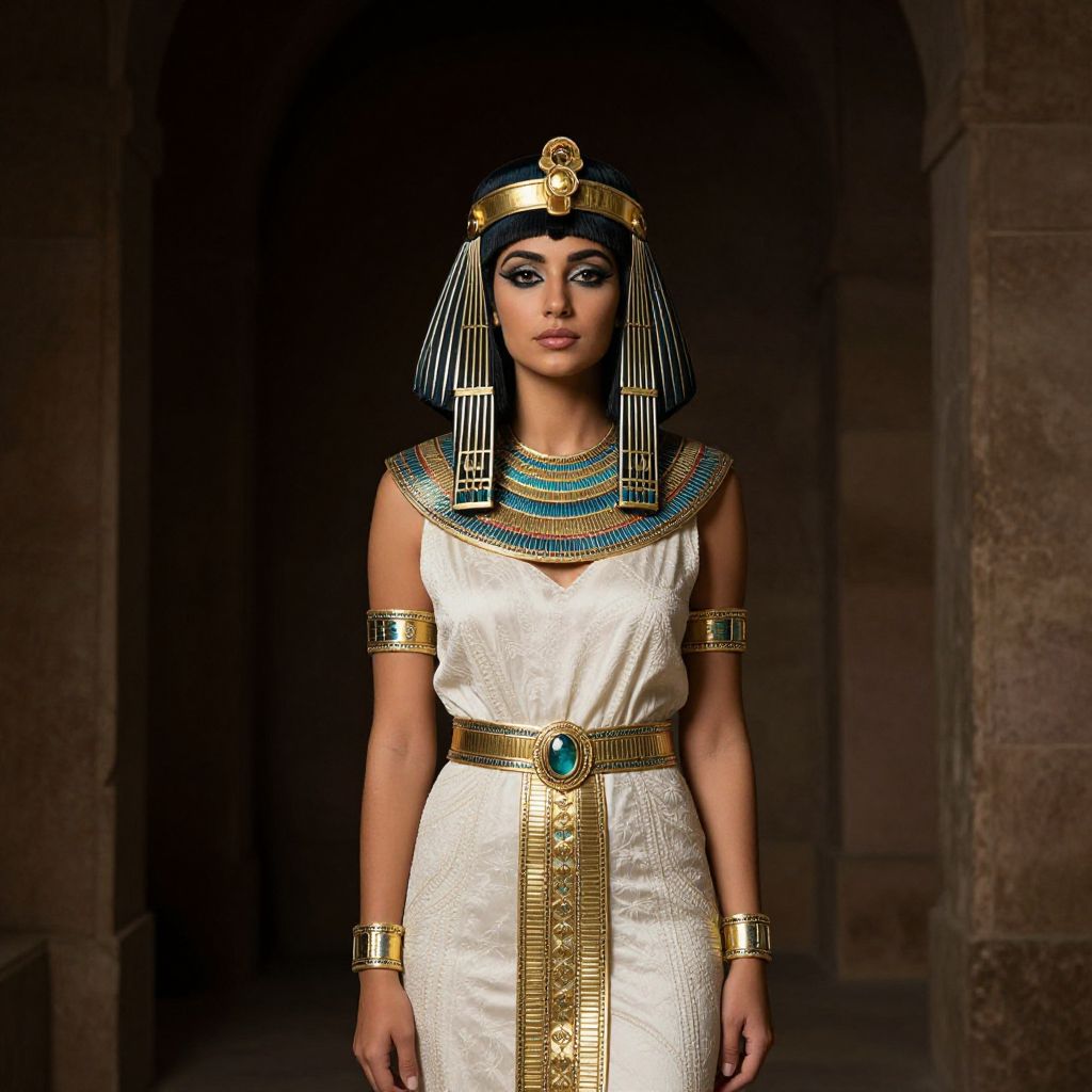 Photograph of a dark-skinned woman in an Egyptian-inspired white dress with gold and turquoise accessories, striped headdress, and stone background.