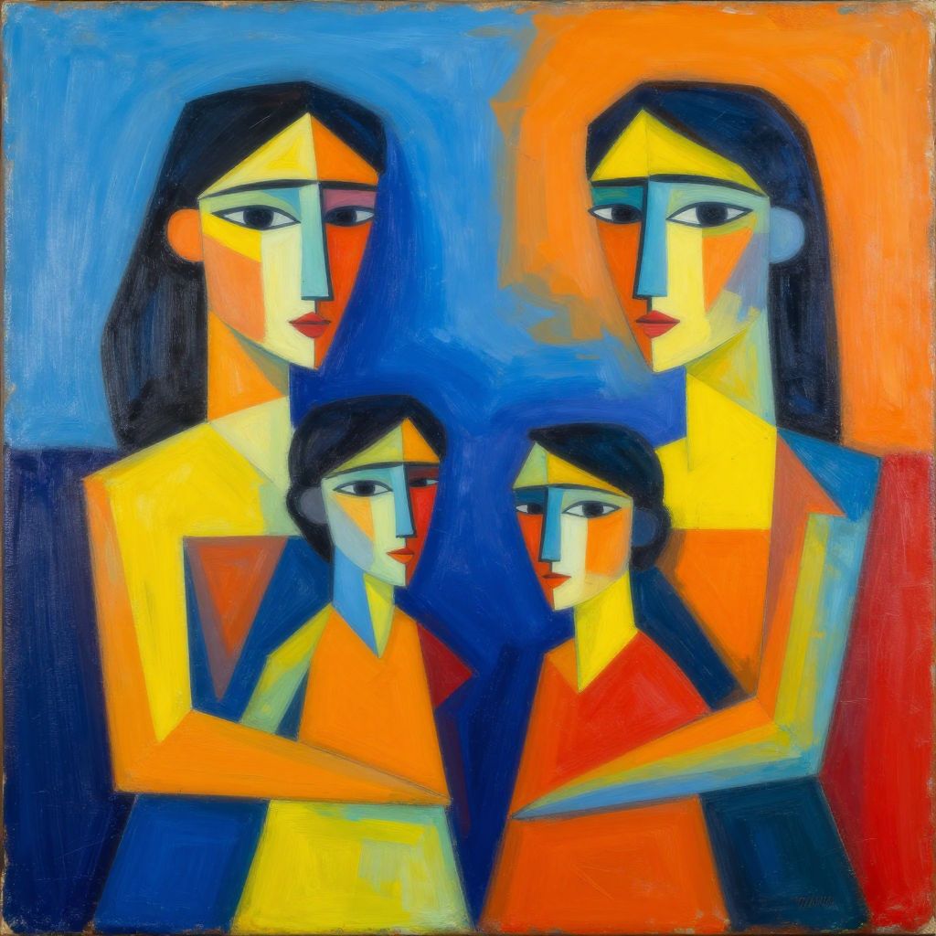 Vibrant abstract painting depicting a family group of four with geometric shapes and bright colors including blue, orange, yellow, and red. The artwork features stylized faces with strong lines and bold patterns, combining cubist and modernist influences.