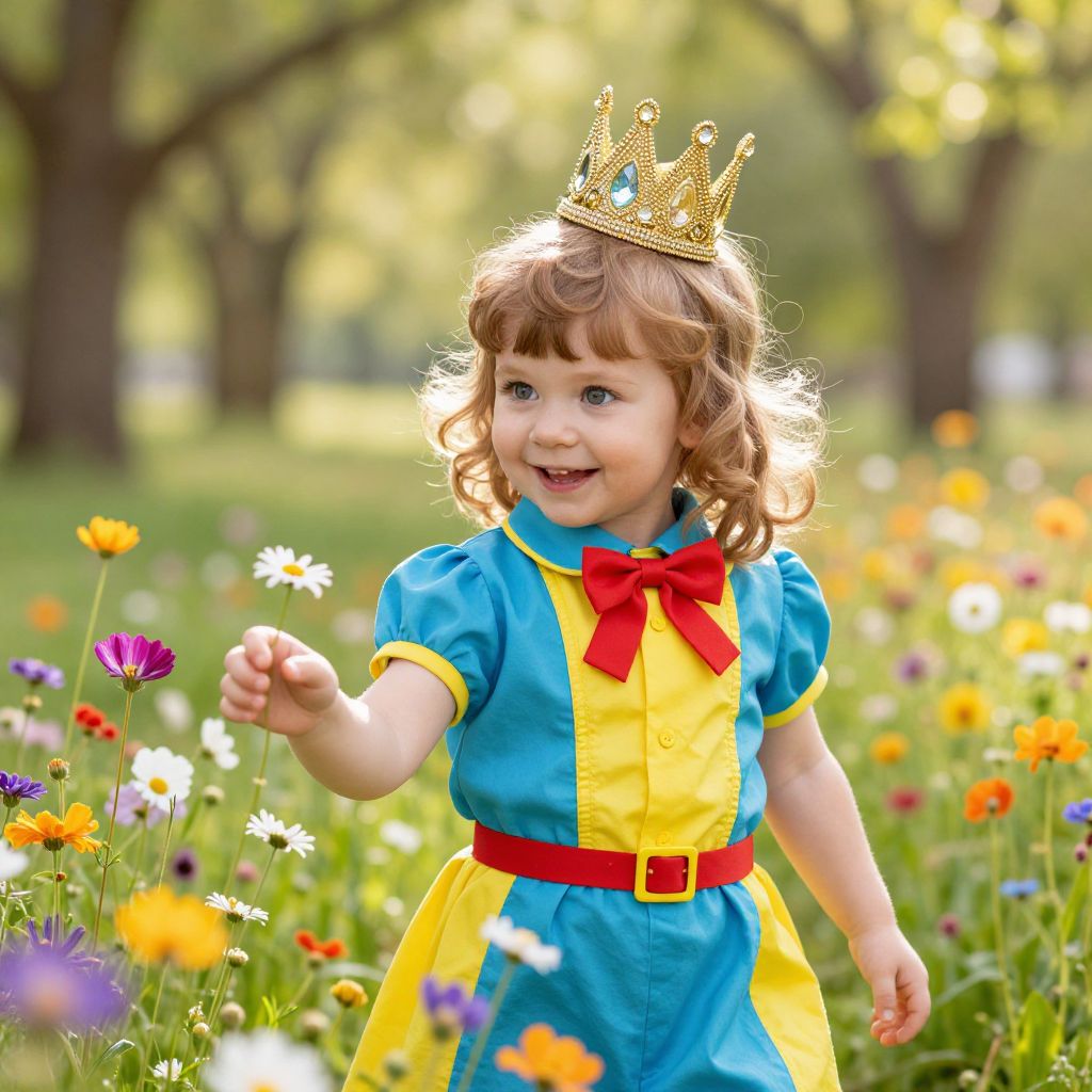 A joyful 5-year-old child, with soft golden-brown hair styled in loose curls and big, expressive eyes that sparkle with curiosity and happiness, wearing a bright blue and yellow outfit with a red bow tie tied neatly around their neck, a golden crown adorned with tiny sparkling jewels resting gently on their head, standing in a sunny meadow filled with vibrant flowers blooming in every color of the rainbow. Soft sunlight filters through the trees, casting dappled patterns on the grass, creating a whimsical and magical atmosphere. The child is smiling warmly, one hand gently reaching out to touch a daisy, as if exploring the world around them, conveying innocence, wonder, and pure delight in the natural beauty of the moment.
