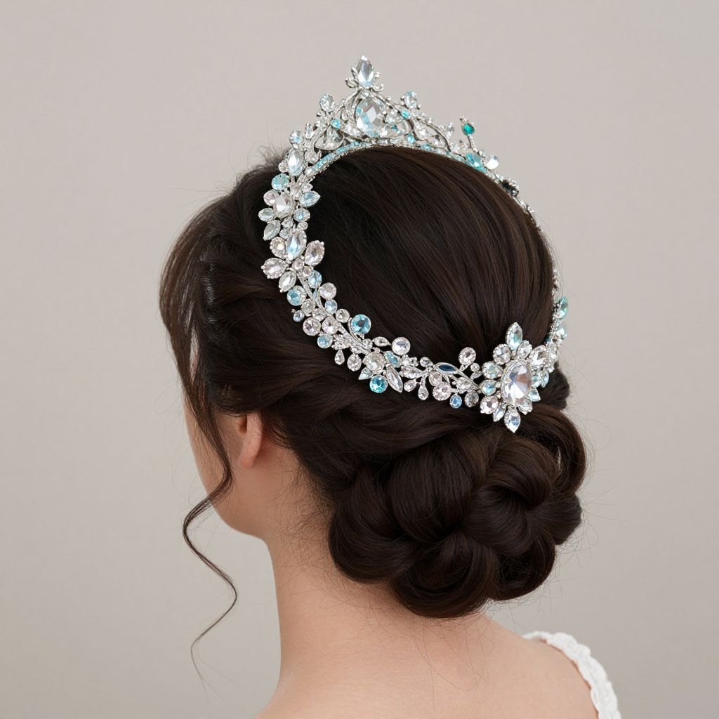 Elegant turquoise hair crown adorned with sparkling crystals and intricate floral designs gracefully embellishes a woman's intricately styled updo, showcasing a blend of fantasy-inspired cosplay and bridal elegance.