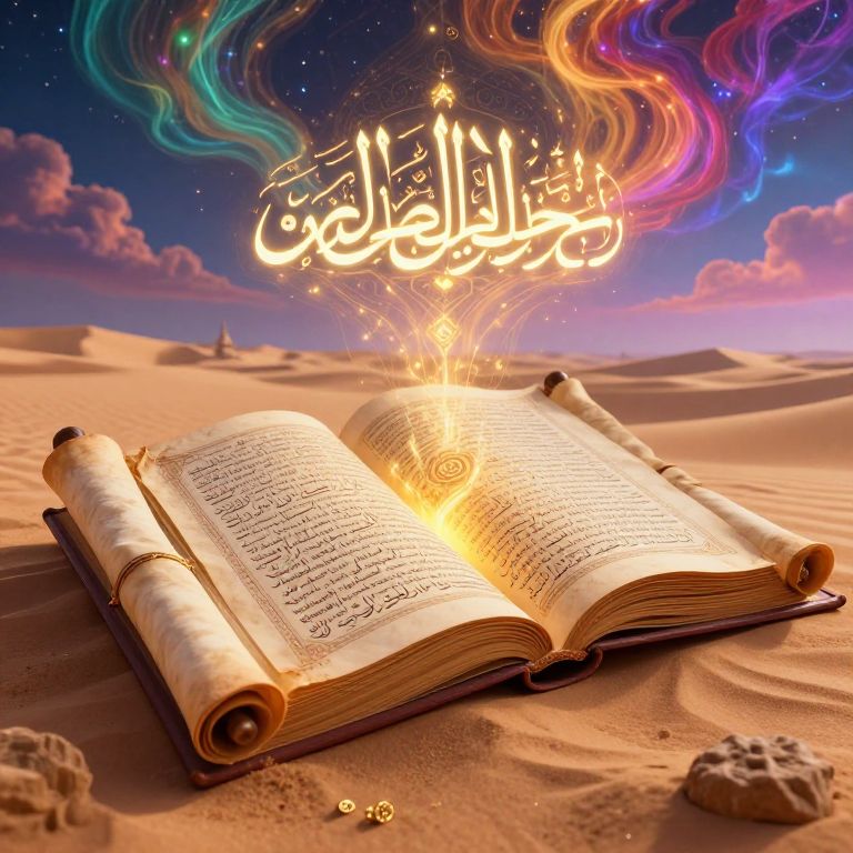 Islamic AI image prompt: An AI-generated sacred space where floating calligraphic verses of the Quran interact with geometric fractals, creating a dynamic, peaceful environment that merges spirituality with digital artistry in a celestial setting.