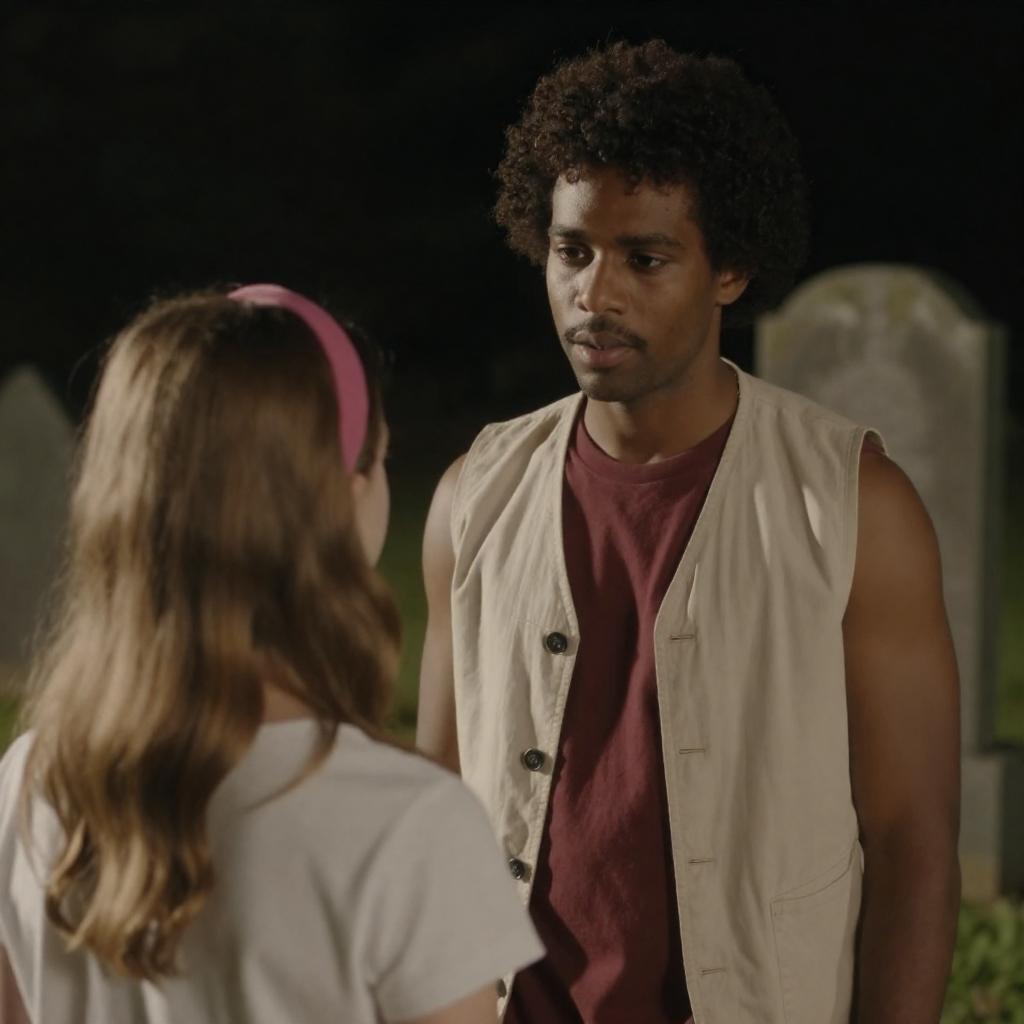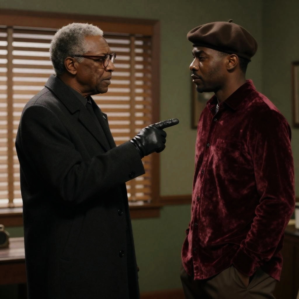 Portrait of a dark-skinned man with curly black hair wearing a black leather jacket over a red shirt. He is extending his right hand, holding a gold ornate object, with an intense expression. The image is set in a dimly lit room with a window in the background.
