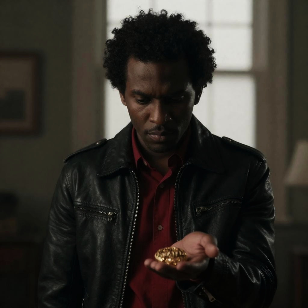 Photograph of a dark-skinned man with curly black hair wearing a black leather jacket over a red shirt, extending his right hand with a gold ornate object in the palm. Intense expression, dimly lit room with window in background.