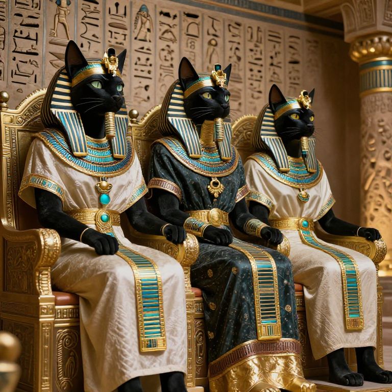 Photograph of three black cats in ancient Egyptian royal attire, seated on ornate golden thrones, adorned with blue and gold jewelry, against a carved