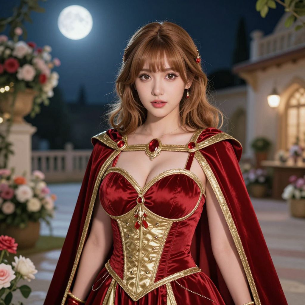 A beautiful woman with warm brown eyes and soft golden-brown hair wears an elegant red and gold costume that features a flowing cape and a detailed corset, standing in a moonlit courtyard during a magical evening festival with blooming night flowers in the background.. The woman has big tits and cute face
