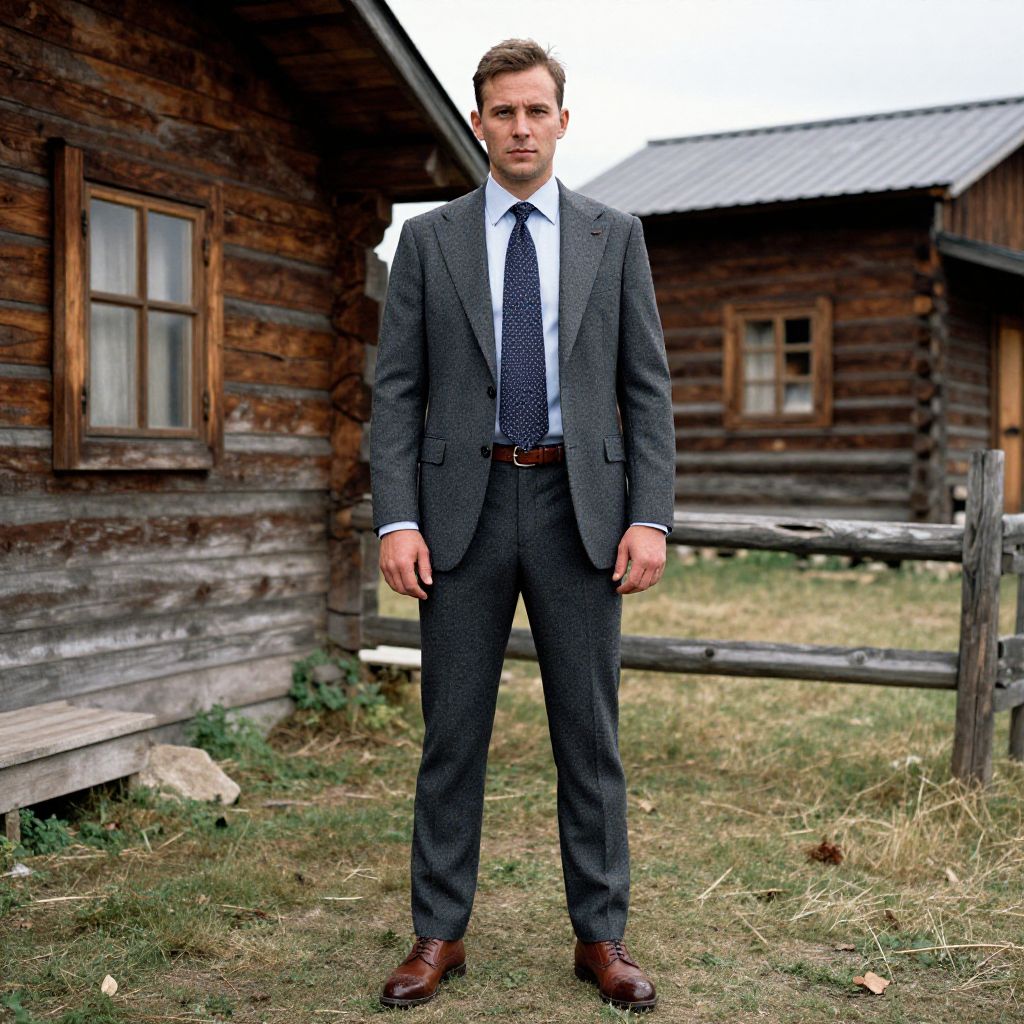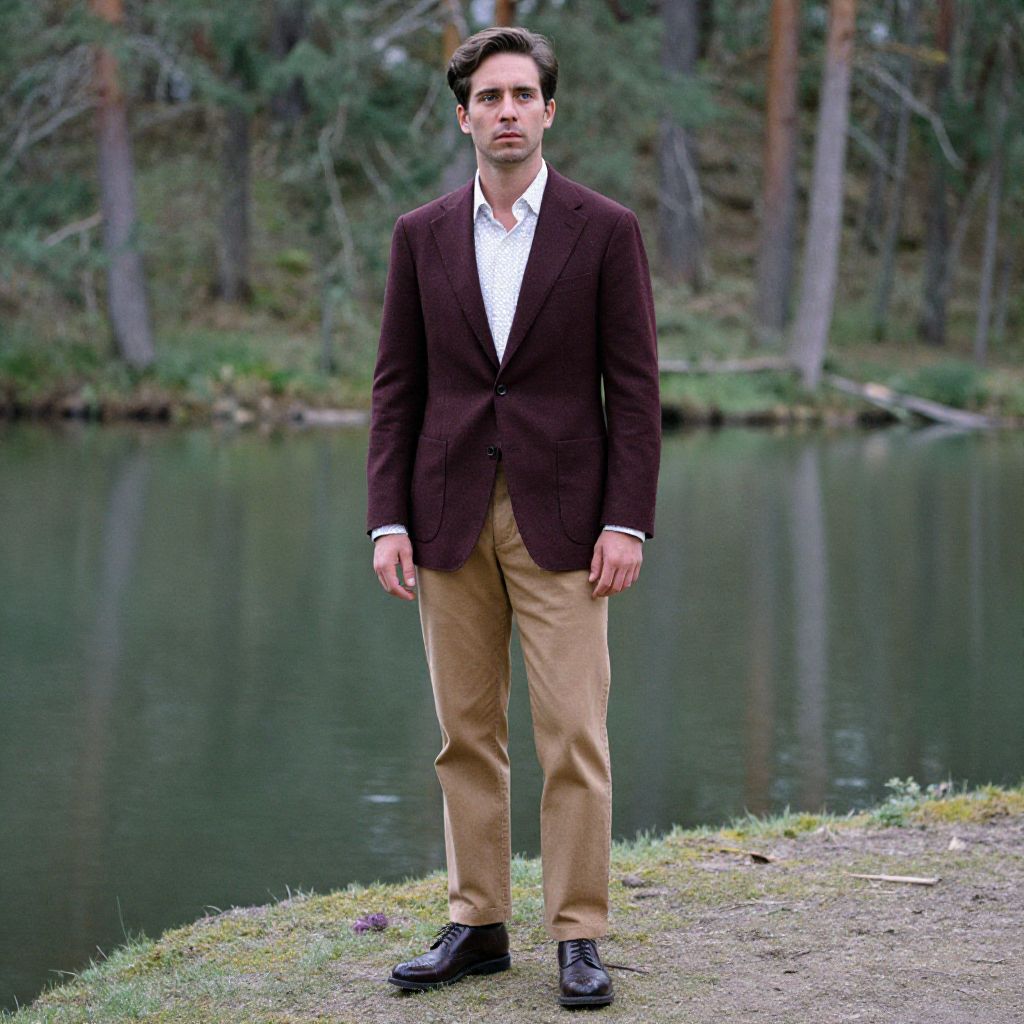 A man, burgundy blazer, patterned white shirt, tan chinos, dark brown brogues, standing by a serene lakeside, towering pines, soft mossy banks, chromogenic film style, contemplative expression. Man has masculine face and piercing eyes