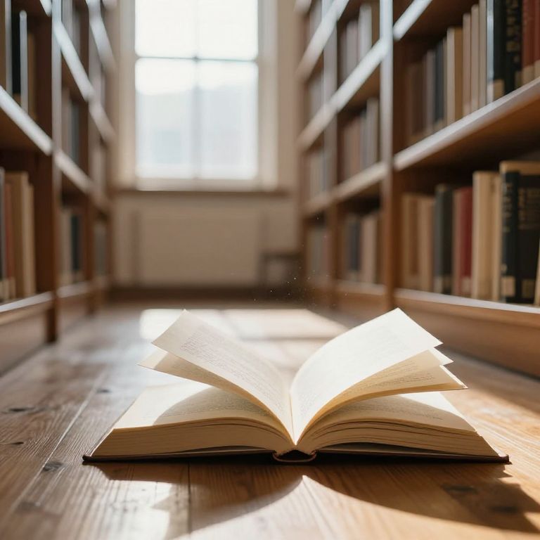 Books rest open on a wooden floor, their pages fluttering upwards as sunlight streams through a distant window, casting a serene glow over rows of bookshelves lined with countless volumes.