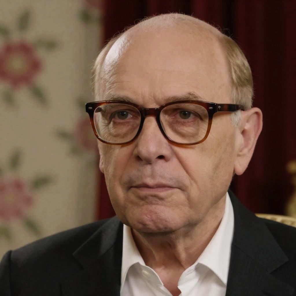 Middle-aged man with balding head, wearing glasses and black suit, leans forward over bar. Three glasses of beer in front. Warm, dimly lit bar background. Man's expression is focused. Bar setting, wooden furniture. Single light source.