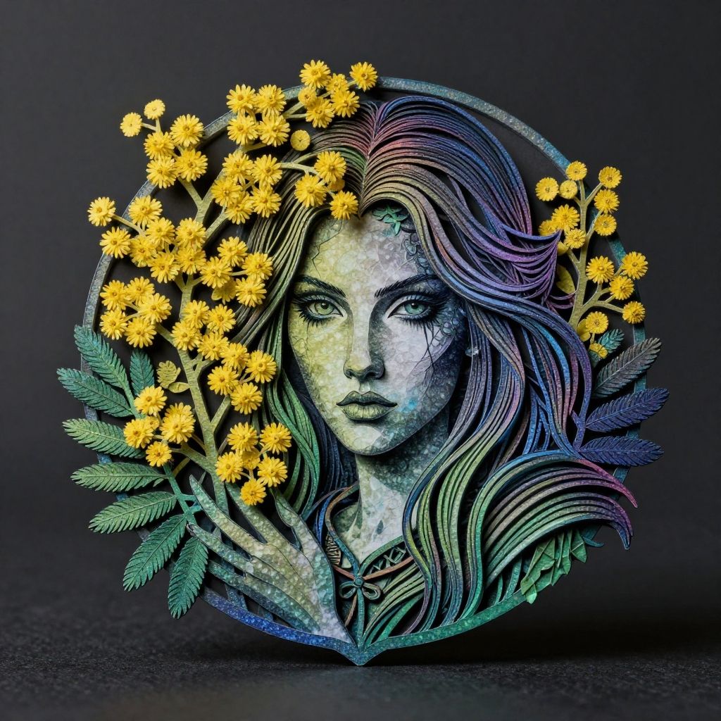 Line art trinket depicting a Mimosa (flower)Aleksandr Deyneka, natural, shimmering, vibrant, gothic, rpg, 1400ad, ultra detailed, detailed, immersive, reminiscent of high fantasy RPG games, HD, masterpiece, best quality, hyper detailed, super realistic, perfect face, perfect hands, award-winning, professional, breathtaking, linquiveraattractive Valleyunwholesome weatherkirigami representation of . 3D, paper folding, paper cutting, Japanese, intricate, symmetrical, precision