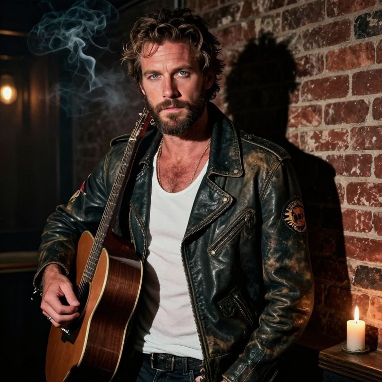 A charismatic musician with rugged good looks and a scruffy beard captivates in this portrait photograph, his misty blue eyes conveying a blend of melancholy and passion. Set against the backdrop of a dimly lit jazz club, he stands amidst cigarette smoke haze and flickering candlelight, his silhouette casting long shadows on the enduring brick wall behind him. Dressed in a worn leather jacket adorned with patches, a white t-shirt showcasing sun-kissed skin, and dark jeans, he exudes an air of sophistication and rugged individualism. His left hand absentmindedly strums an old guitar slung over his shoulder as his gaze locks with the camera, evoking raw emotion and intimacy. This close-up portrait not only highlights his striking features but also captures the unique ambiance of the club, showcasing a dynamic interplay between light and shadow that reveals the depth and complexity of this enigmatic character.