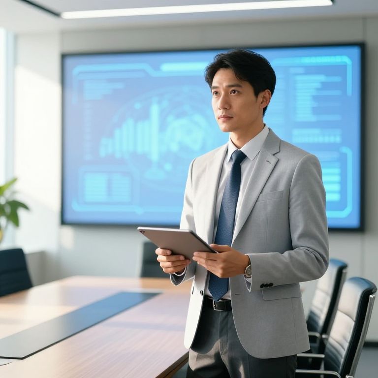 A focused businessman in a light grey suit, sitting at a wooden desk in a calm, natural office setting with plants and a view of a green park. He reviews a presentation on his laptop, conveying calm intelligence and forward-thinking leadership. Warm lighting enhances authenticity and professionalism.