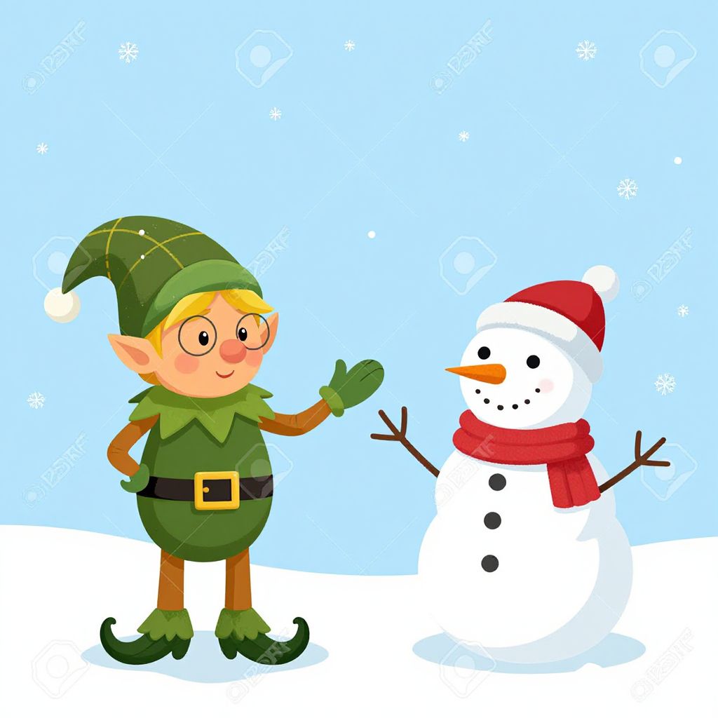 Cartoon elf with green outfit and hat, smiling, waving at a snowman with red hat and scarf, standing on snowy ground.