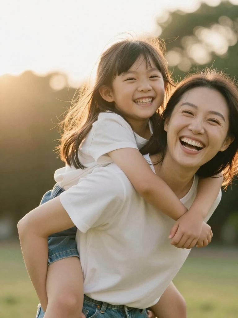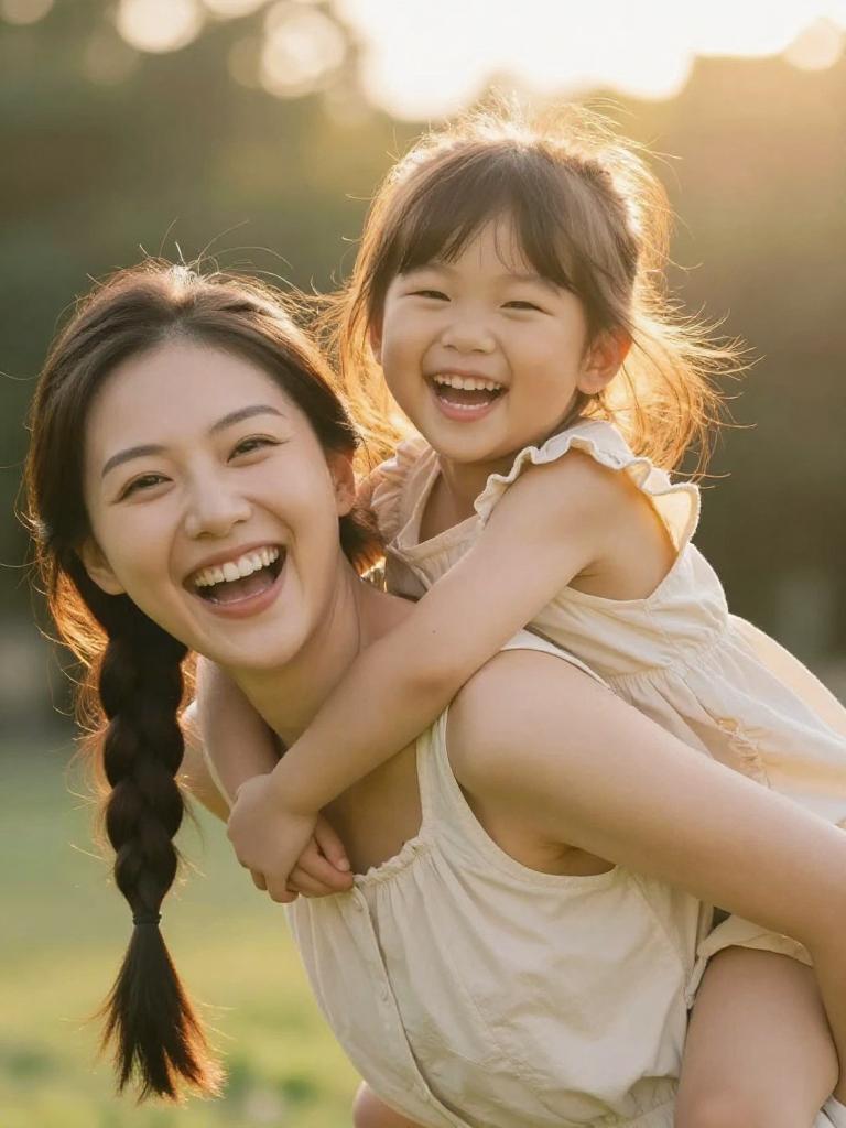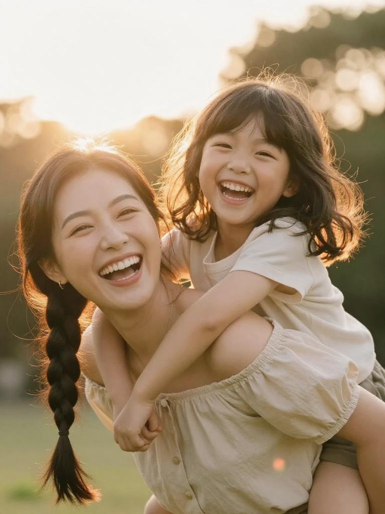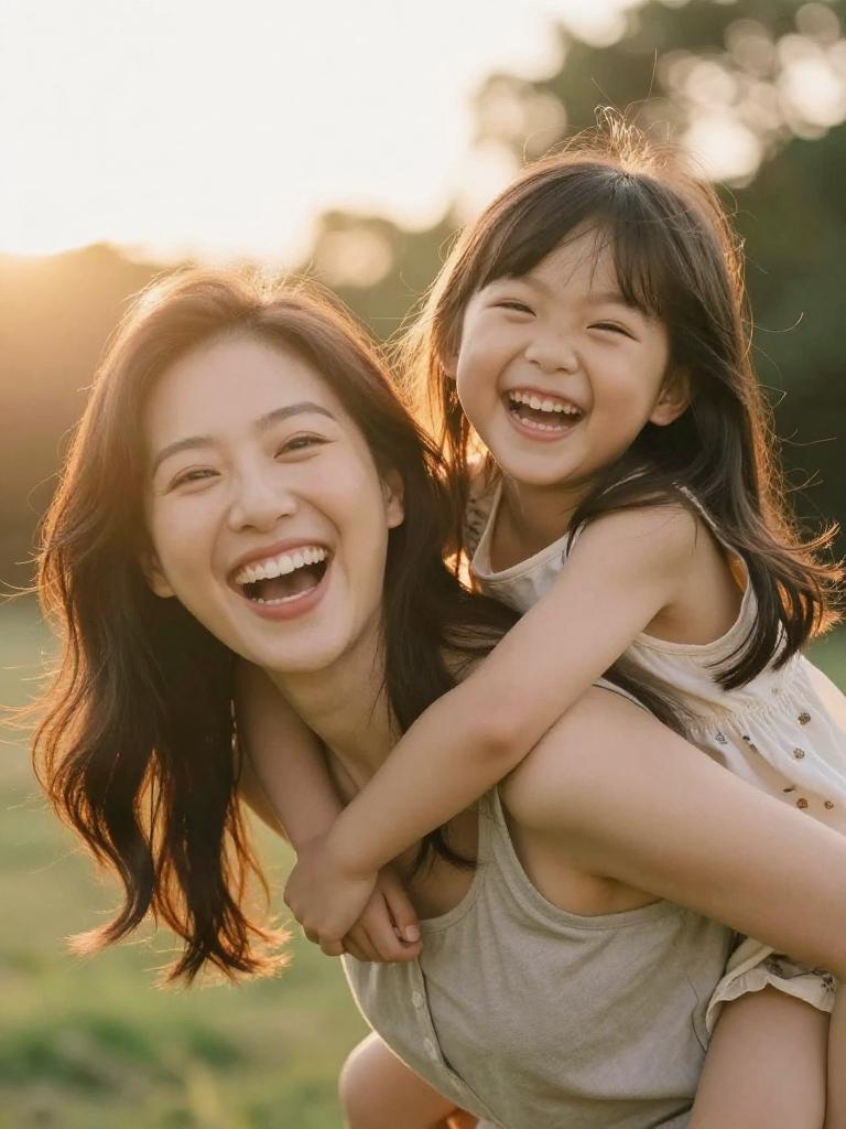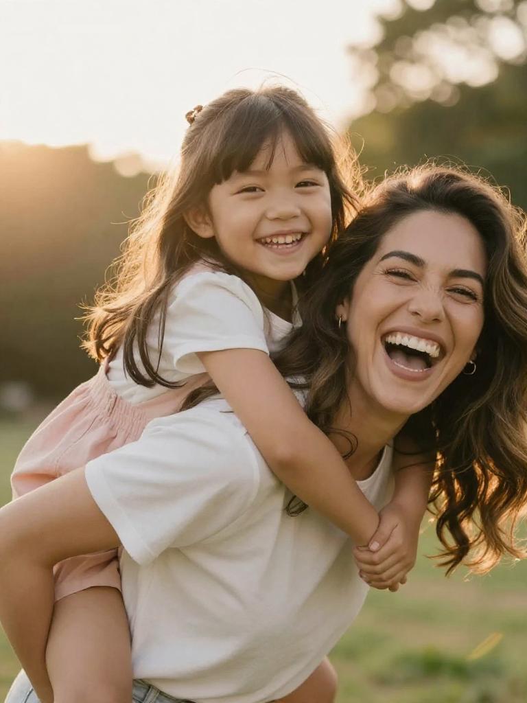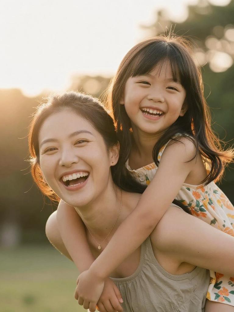 Mother and daughter, joyful close-up of a mum carrying her daughter on her back, both laughing toward the camera, mum with chestnut wavy hair and wide smile and Asian girl with straight hair and dimpled smile, mum in tank top and daughter in sundress, golden-hour sunlight with warm lens flare, soft-focus trees and sky in the background, vibrant outdoor family lifestyle stock photo, high resolution, ultra-detailed