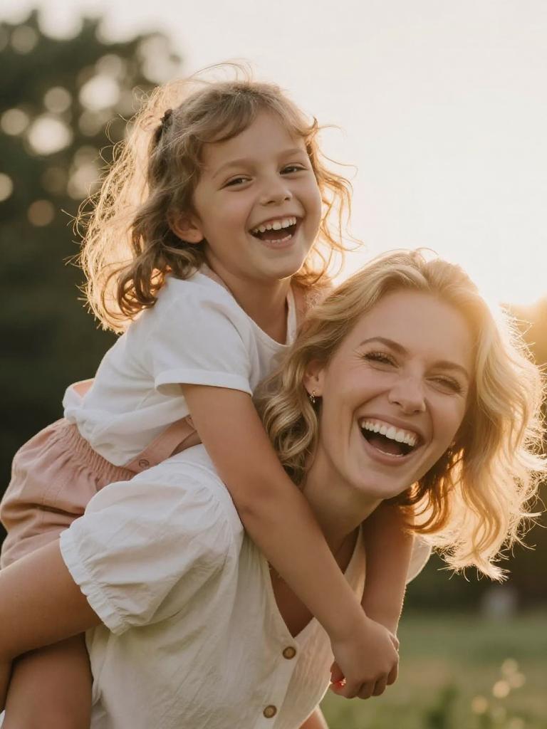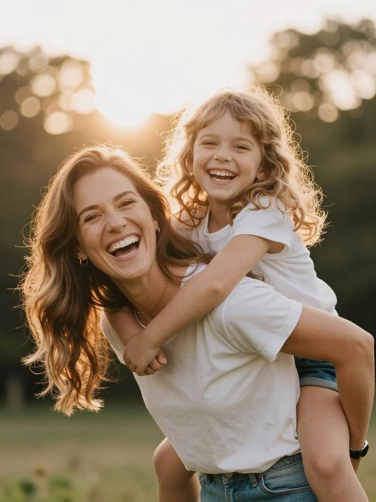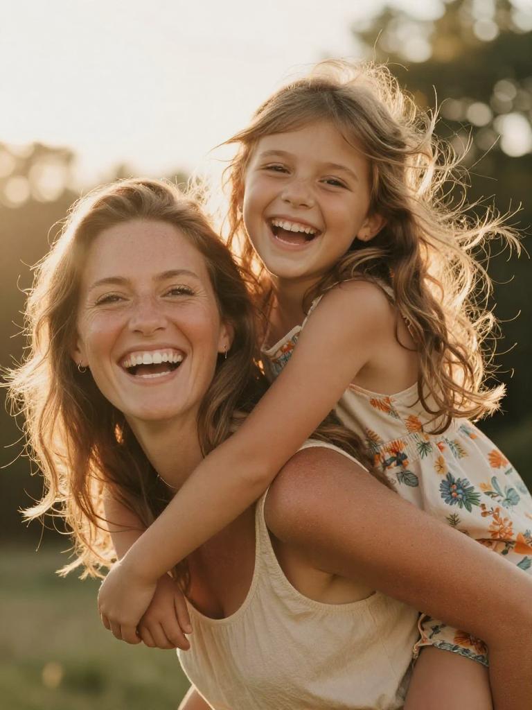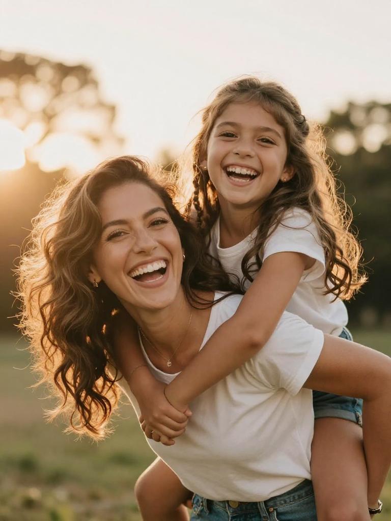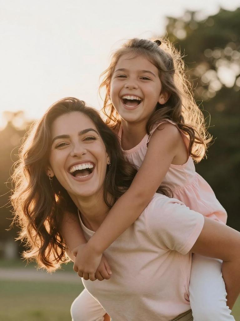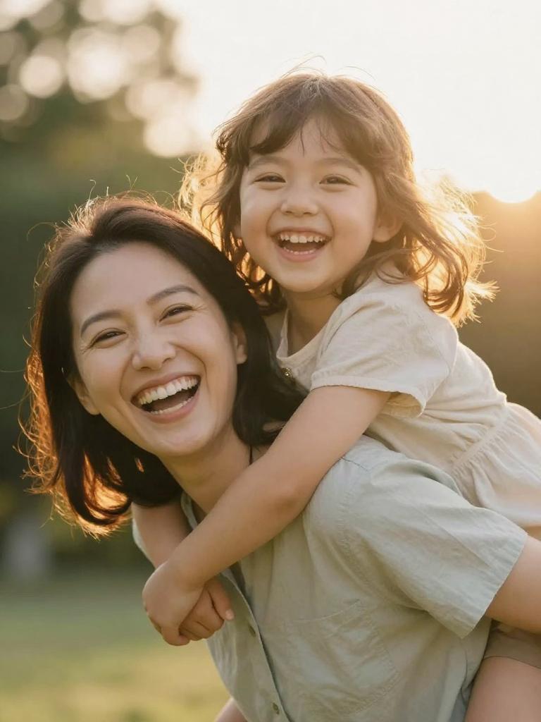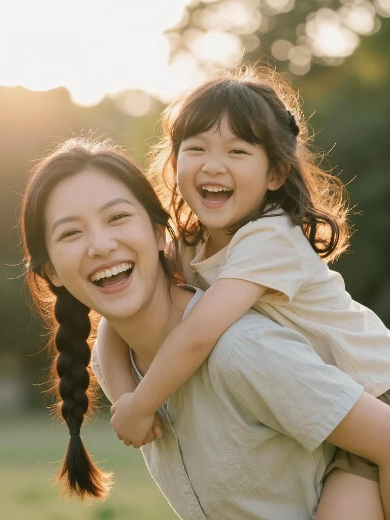 Mother and daughter, joyful close-up of a mum carrying her daughter on her back, both laughing toward the camera, mum with chestnut wavy hair and wide smile and Asian girl with straight hair and dimpled smile, mum in tank top and daughter in sundress, golden-hour sunlight with warm lens flare, soft-focus trees and sky in the background, vibrant outdoor family lifestyle stock photo, high resolution, ultra-detailed