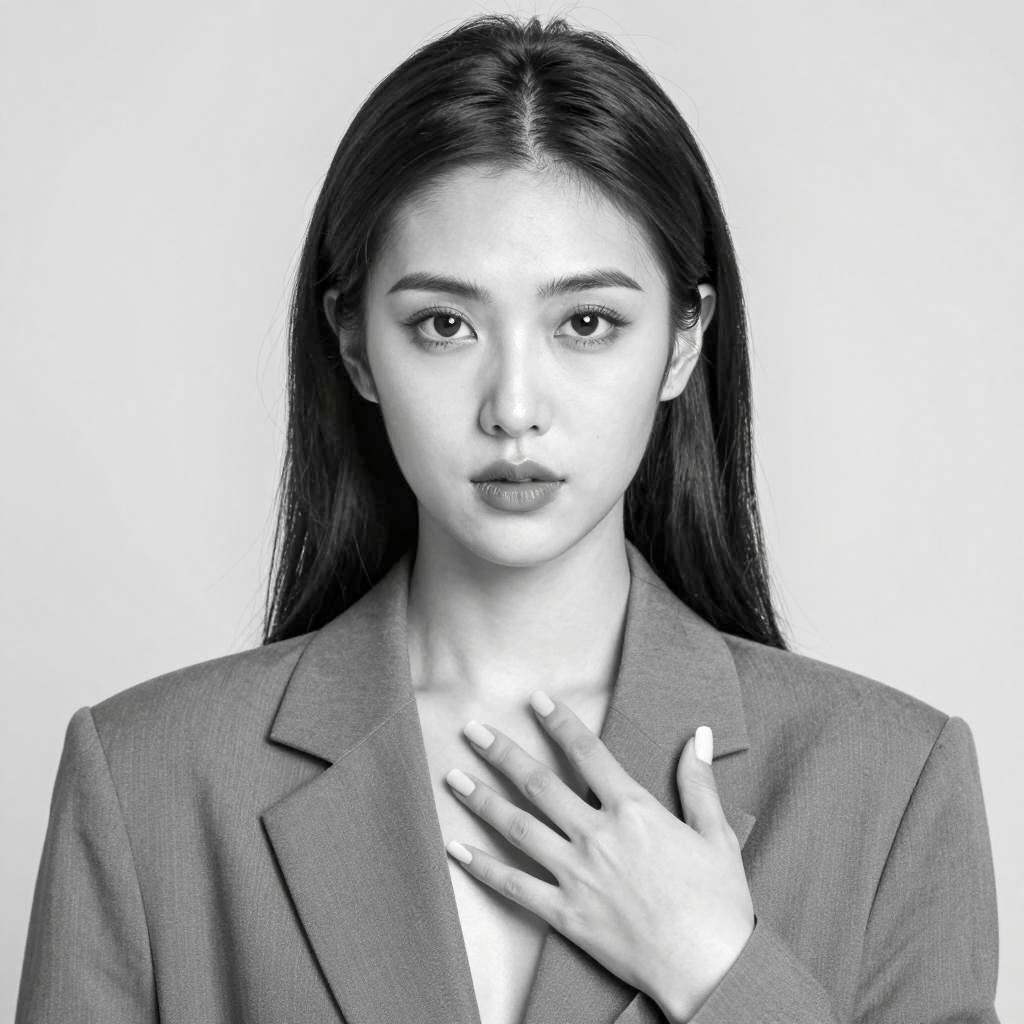 Black and white photo of a woman with medium-length straight dark hair, parted in the middle. She has dark, defined eyebrows, large eyes with heavy makeup, and full lips. She wears a loose-fitting blazer with her right hand touching her chest. Her nails are long and manicured. The background is plain and light gray. She has a neutral, slightly intense expression.
