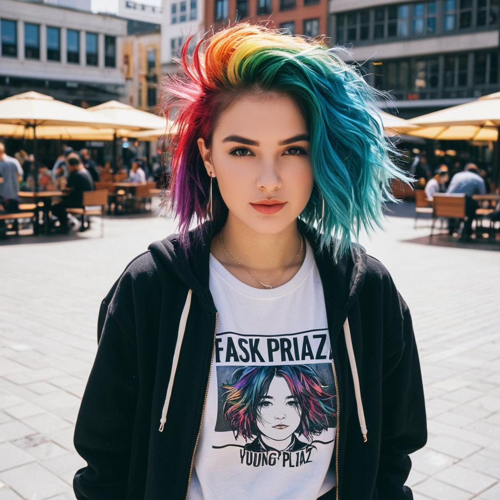 Rainbow Hair hairstyle on young woman, wearing urban streetwear, in city plaza, captured in fashion editorial style with dynamic daylight.
