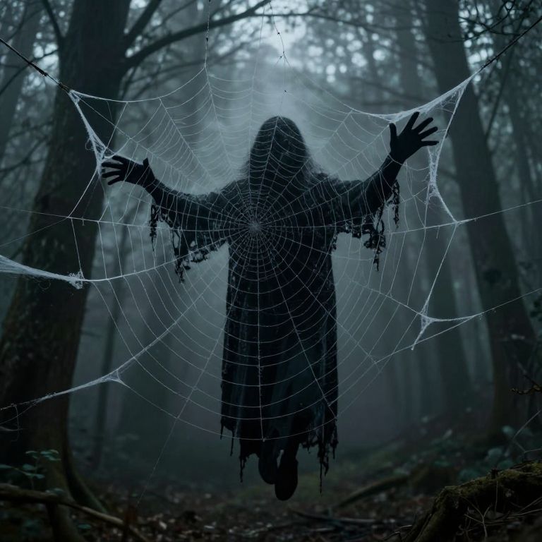 A haunting digital artwork depicts a spectral figure suspended amidst an intricate spiderweb, its arms outstretched as if weaving a tale of mystery and dread, set against the eerie backdrop of a misty forest rendered in moody, atmospheric tones.