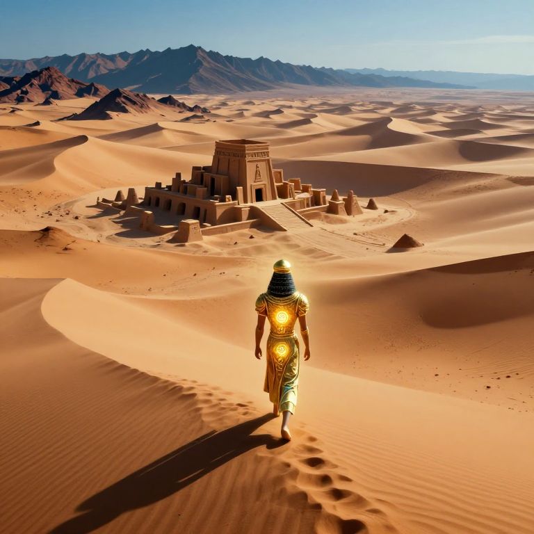 Envision a surreal, dreamlike landscape reminiscent of Dalí's surrealist masterpieces. From an aerial viewpoint, observe a vast, undulating desert stretching towards distant mountain ranges forming jagged silhouettes against the horizon. A mysterious figure, evocative of ancient Mesopotamian mythology, strides toward a colossal sunken city partially submerged beneath the sand dunes. This enigmatic being, clad in intricate golden armor etched with celestial symbols, emits an ethereal glow as it traverses through the otherworldly terrain. The dramatic lighting casts sharp shadows and vibrant colors, evoking a sense of awe and intrigue, beckoning viewers to ponder the secrets concealed within this captivating artwork.