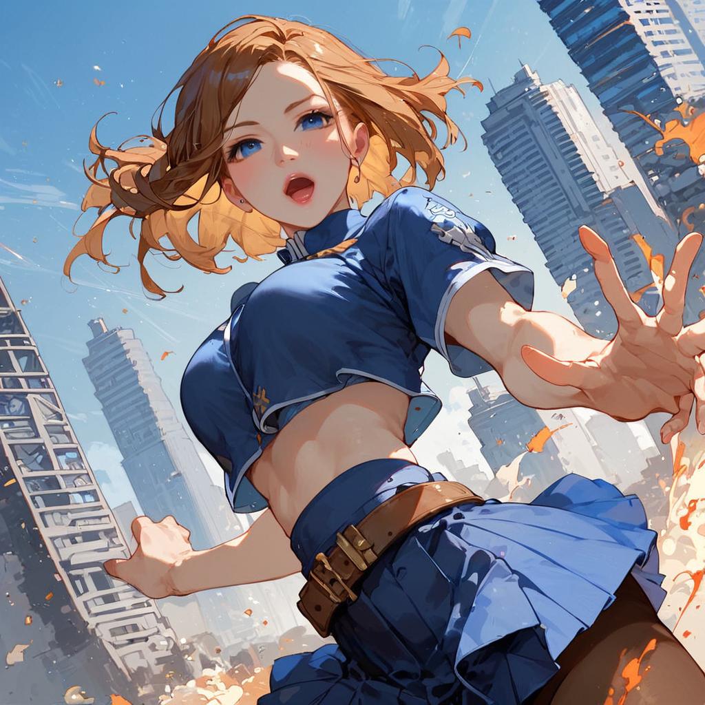 Score_9, score_8_up, score_7_up, source_anime, nobarakugisaki, nobara kugisaki, bob cut, brown eyes, brown hair, lips, short hair, belt, brown belt, brown pantyhose, crop top, crop top overhang, jujutsu tech uniform, pantyhose, pleated skirt, shirt tucked in, skirt, blue skirt, blue crop top, outdoors, cityscape, fighting stance, shouting, open mouth, looking at viewer, cowboy shot, dutch angle