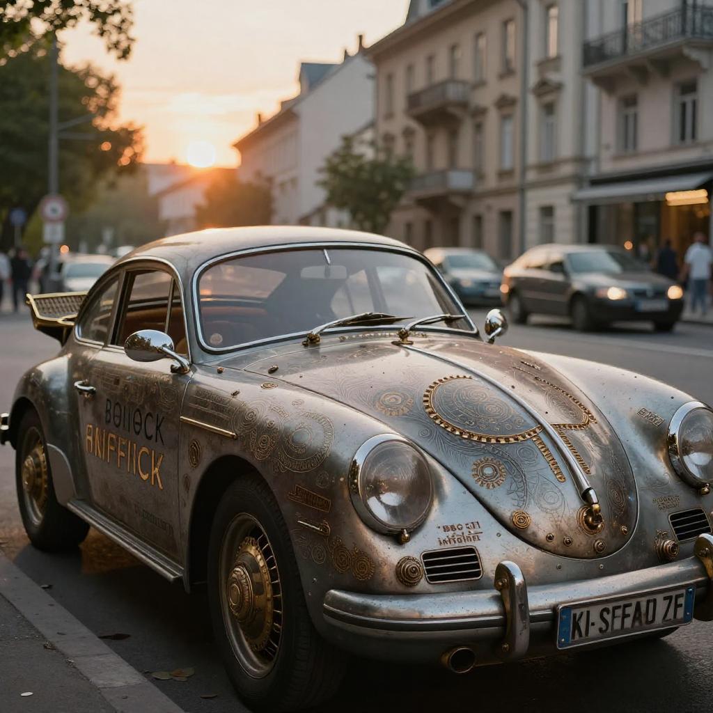 ((Synthwave)), 30mm, icanon, sony, dof, photograph, realistic, 500px, car photographty, (bioshock infinite), intricate, ((steampunk)), teampunk car, closeup of an ((steampunk porsche)), bucharest city streets, sunset, arcane punk, intricate details, warm light, soft light