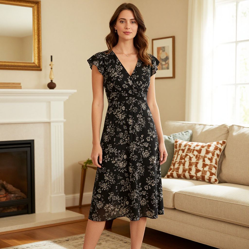 Woman modeling the Gabby Dress in Black Floral stands gracefully in a cozy living room, featuring a fireplace to her left, a window with natural light streaming in to her right, and a beige sofa adorned with patterned pillows behind her.