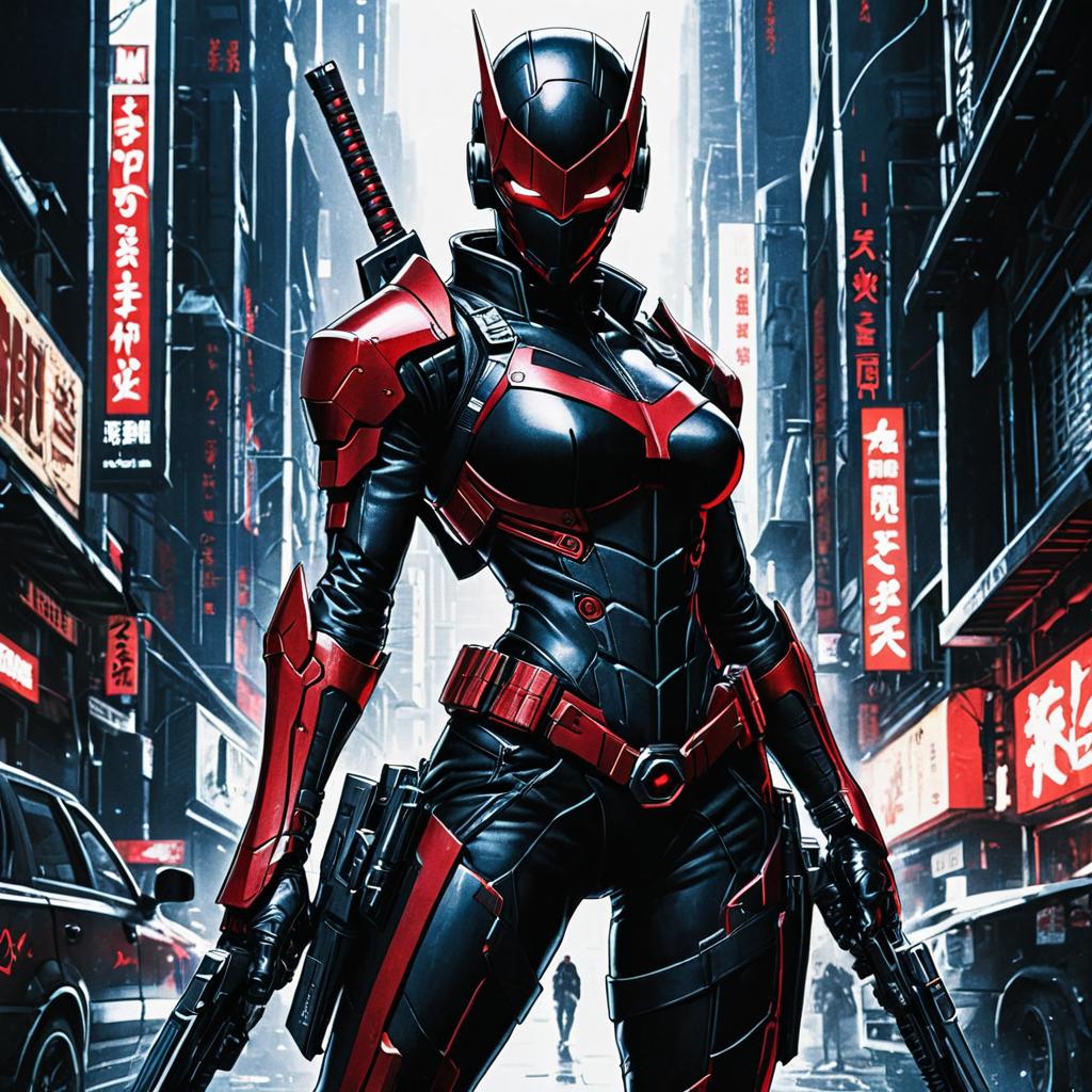 Full-body digital artwork of a cybernetic assassin inspired by Marvel comics, featuring matte black and crimson armor. The futuristic character is equipped with a katana on the back and a sleek gun in one hand, set against a dark cyberpunk cityscape with towering buildings and neon lights, showcasing a blend of Masamune Shirow and cyberpunk art styles.