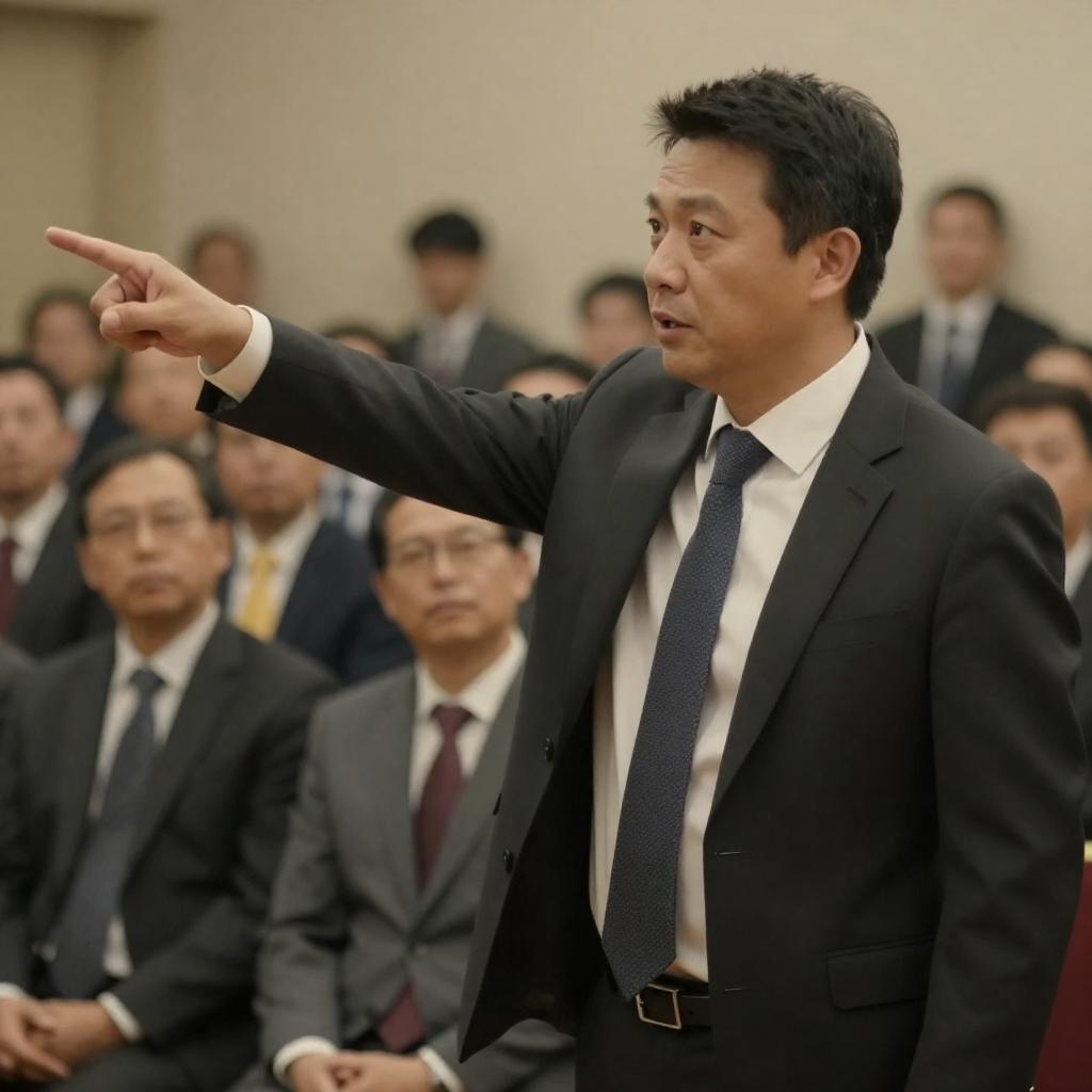Photograph of a group of men in dark suits standing around a large, illuminated world map in a modern, multi-level room. They are engaged in a strategic discussion, with some standing on upper levels and others on the main floor. The map has yellow lines and a blue aircraft graphic in the bottom left corner.