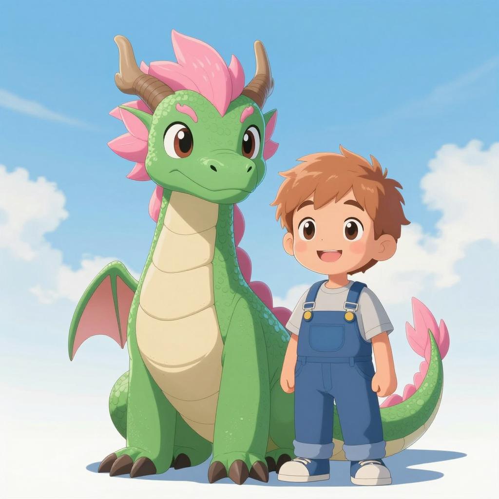 Digital illustration of a green dragon with pink hair and a long tail with pink fins, standing next to a smiling young boy with light brown hair. Boy wears gray shirt and blue overalls. Bright blue sky with scattered clouds in the background. Dragon's eyes are wide and friendly, both subjects facing forward.