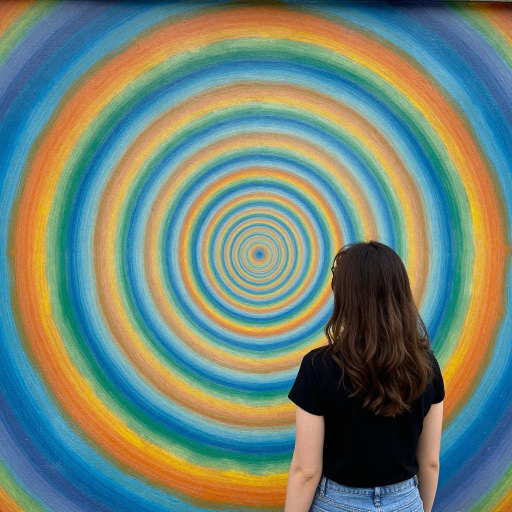 Woman observing a vibrant, kaleidoscopic mural featuring concentric circles and spirals in shades of blue, green, orange, and yellow, creating a mesmerizing optical illusion of depth and movement.