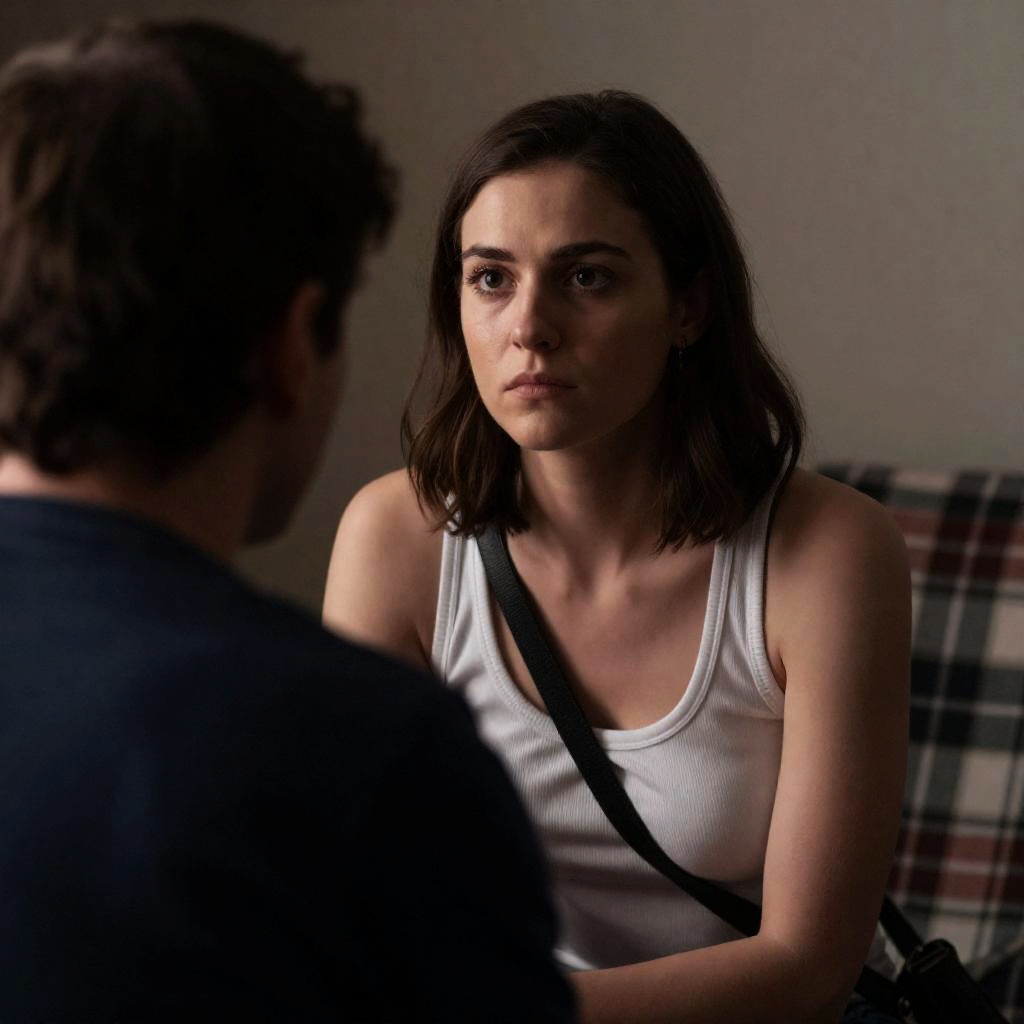 Close-up photograph of a tense scene. Man with curly hair on left, face partially shadowed. Woman with long, light brown hair on right, illuminated by warm, orange light, looking intently at man. Background includes soft, glowing lights.