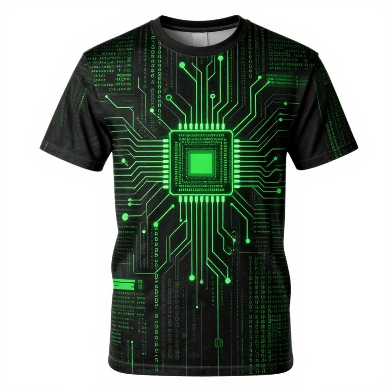 AI tshirt design presenting a detailed schematic of AI circuits and microchips intertwined with digital code patterns, rendered in sharp contrasts of green and black, evoking a hacker aesthetic that appeals to technology lovers and gamers.