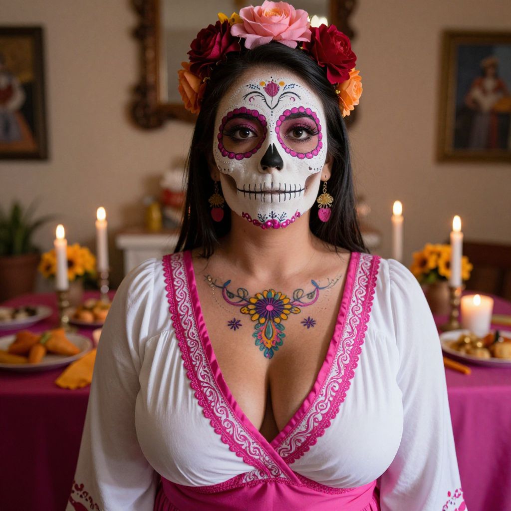 Photograph of a woman with a fair skin tone, dark long hair, and large breasts, wearing a traditional Day of the Dead face paint with pink and purple patterns, a white dress with pink lace trim, and a colorful flower crown. She has a vibrant, symmetrical chest tattoo and wears pink earrings. The background features a warmly lit dining room with lit candles, a table covered in a pink tablecloth, and plates with food. The walls have framed pictures, adding a cozy, festive atmosphere. The image emphasizes cultural celebration and decorative details.