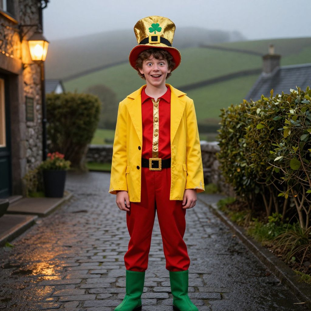 A realistic photography of a teenage boy wearing a detailed leprechaun teen costume, with a red and gold outfit, green boots, a gold hat with a tiny shamrock, and a bright yellow jacket. He has a cheerful, mischievous face with wide-eyed expression, fair skin, and curly brown hair. The setting is a misty Irish countryside village pub during the evening, with warm golden lights from lanterns and a backdrop of green hills and a small, leafy hedge. The costume is well-put-together, slightly messy at the edges to look authentic.