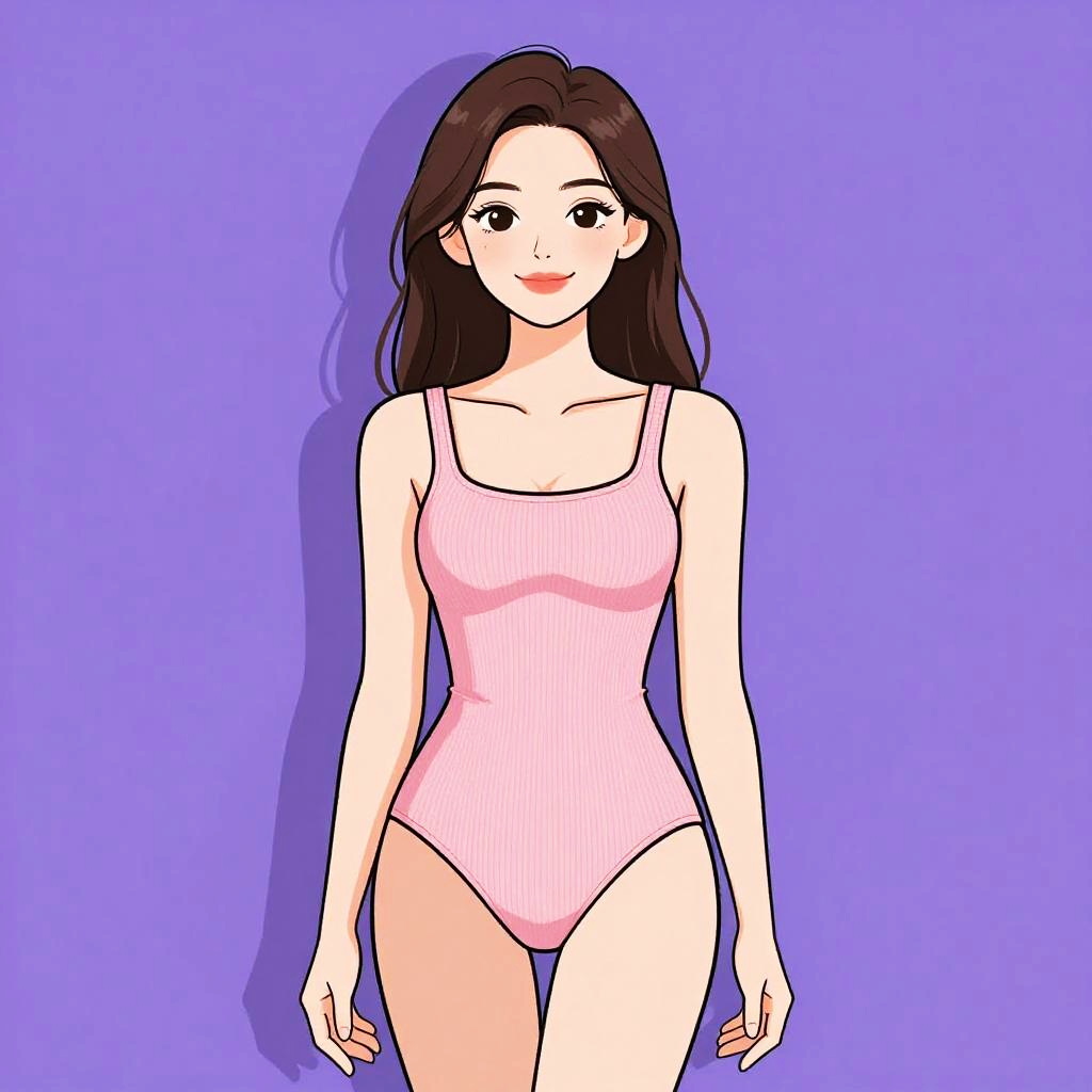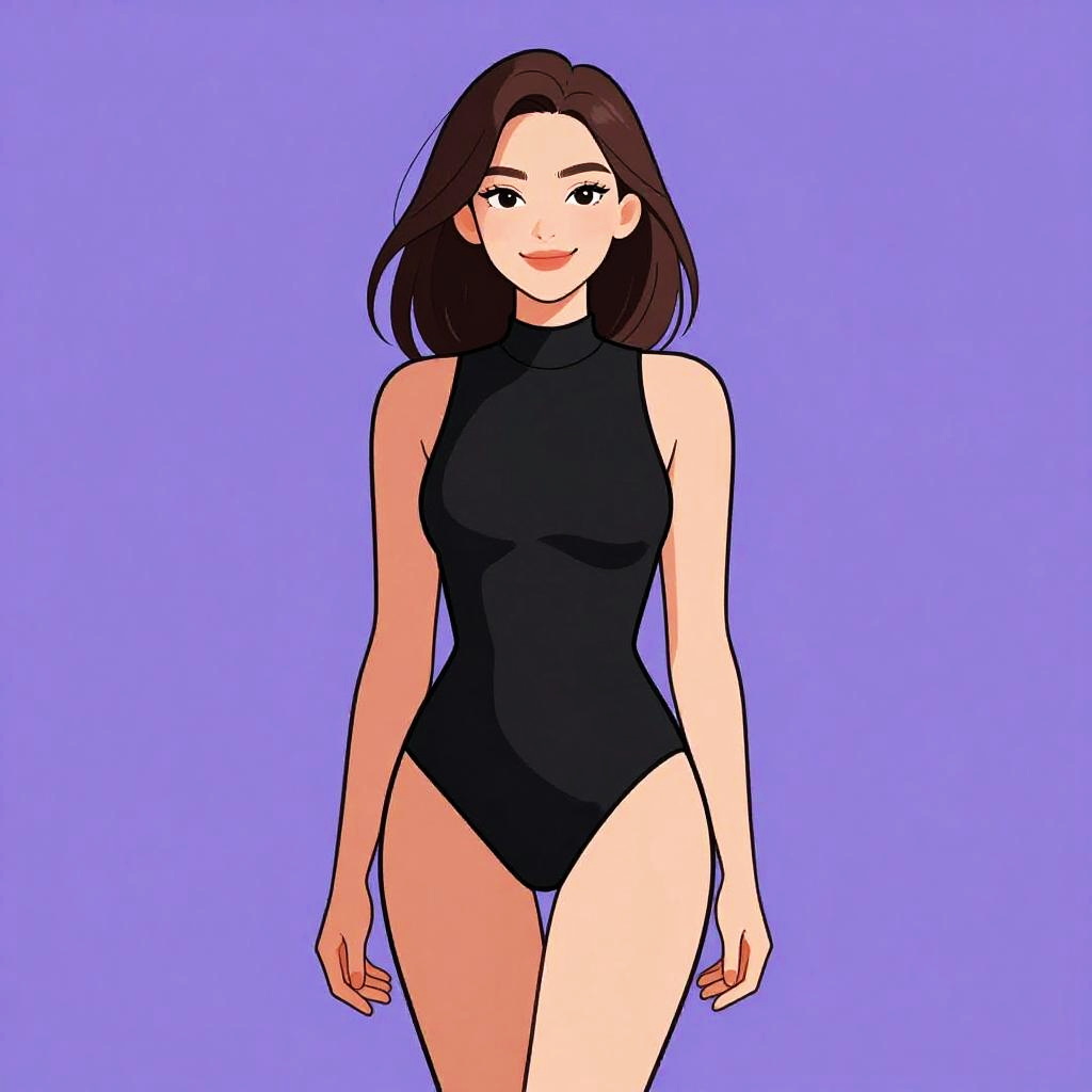 Digital illustration of a smiling woman with purple hair, wearing a black one-piece swimsuit, standing against a light purple background.