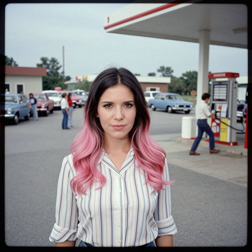 Analog film photo solo, zstyle, realistic, ((woman)), (((Black and pink ombre hair))), (((happy512))), (Striped button-up blouse with a classic collar and roll-up sleeves), ((gas shortage: Long lines of cars snake around gas stations, reflecting the energy crisis of the 1970s, with worried drivers hoping to fill up their tanks)), ((dynamic pose)), PA7_Human-Likeness, PA7_Photo, high detailed, 8k, clear facial features, pastel themed colorgrade, in style of wes anderson, desaturated, 35mm photo, grainy, vignette, vintage, Kodachrome, Lomography, stained, highly detailed, found footage