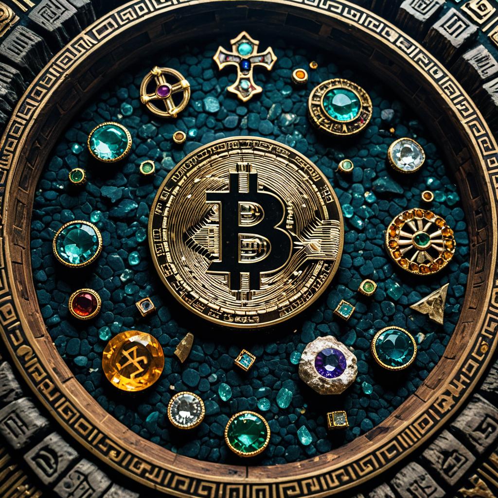 Bitcoin Logo as Ancient Artifact with Gemstones