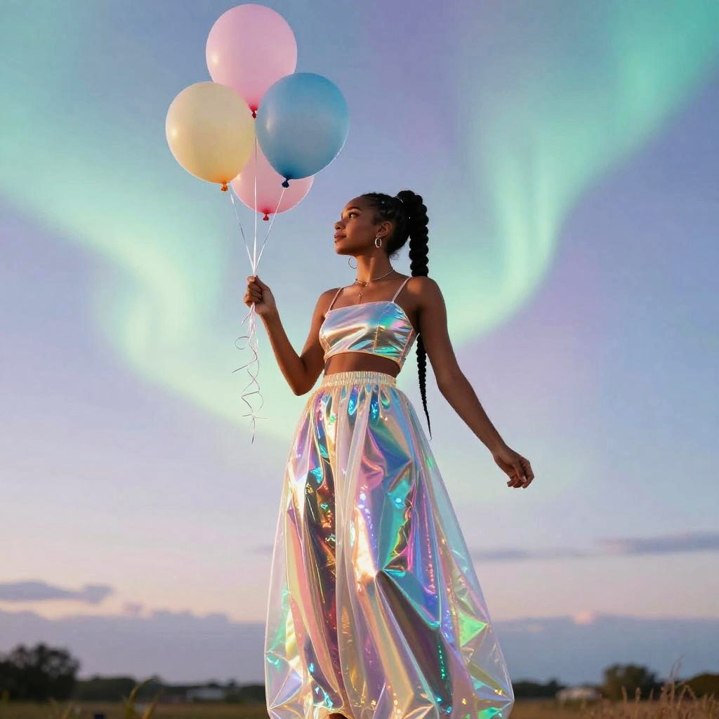 Afrofuturism woman with high braided ponytail, holding helium balloons, dressed in flowing holographic maxi skirt and crop top, pastel aurora borealis sky.