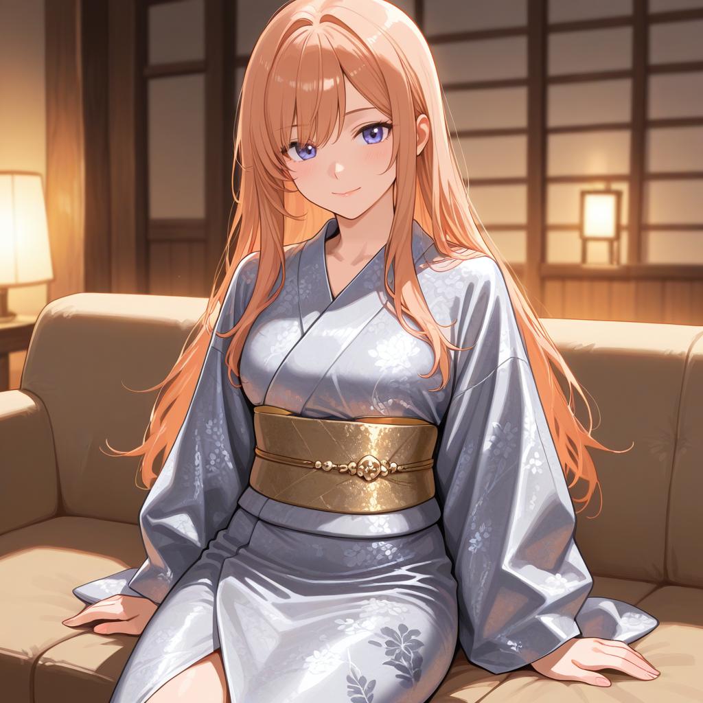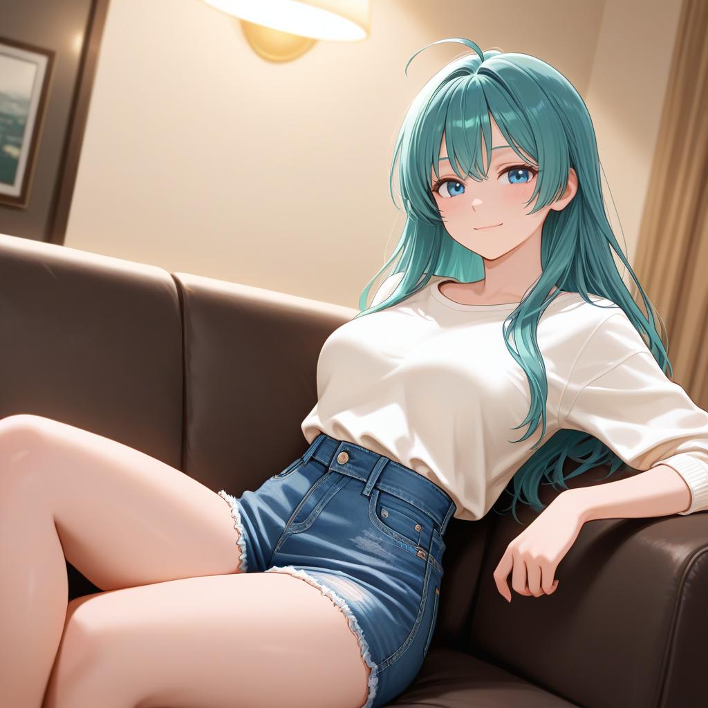 Realistic digital artwork of a light-skinned woman with auburn hair, smiling pleasantly while sitting on a beige sofa. She is dressed in a white fitted t-shirt and high-waisted vintage denim jeans. The setting appears to be a cozy, softly lit urban apartment with warm lighting contributing to a serene yet playful atmosphere.