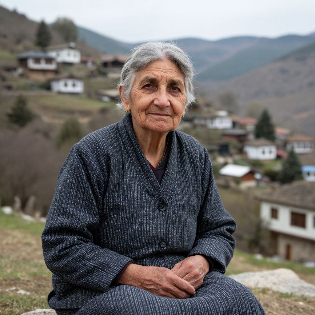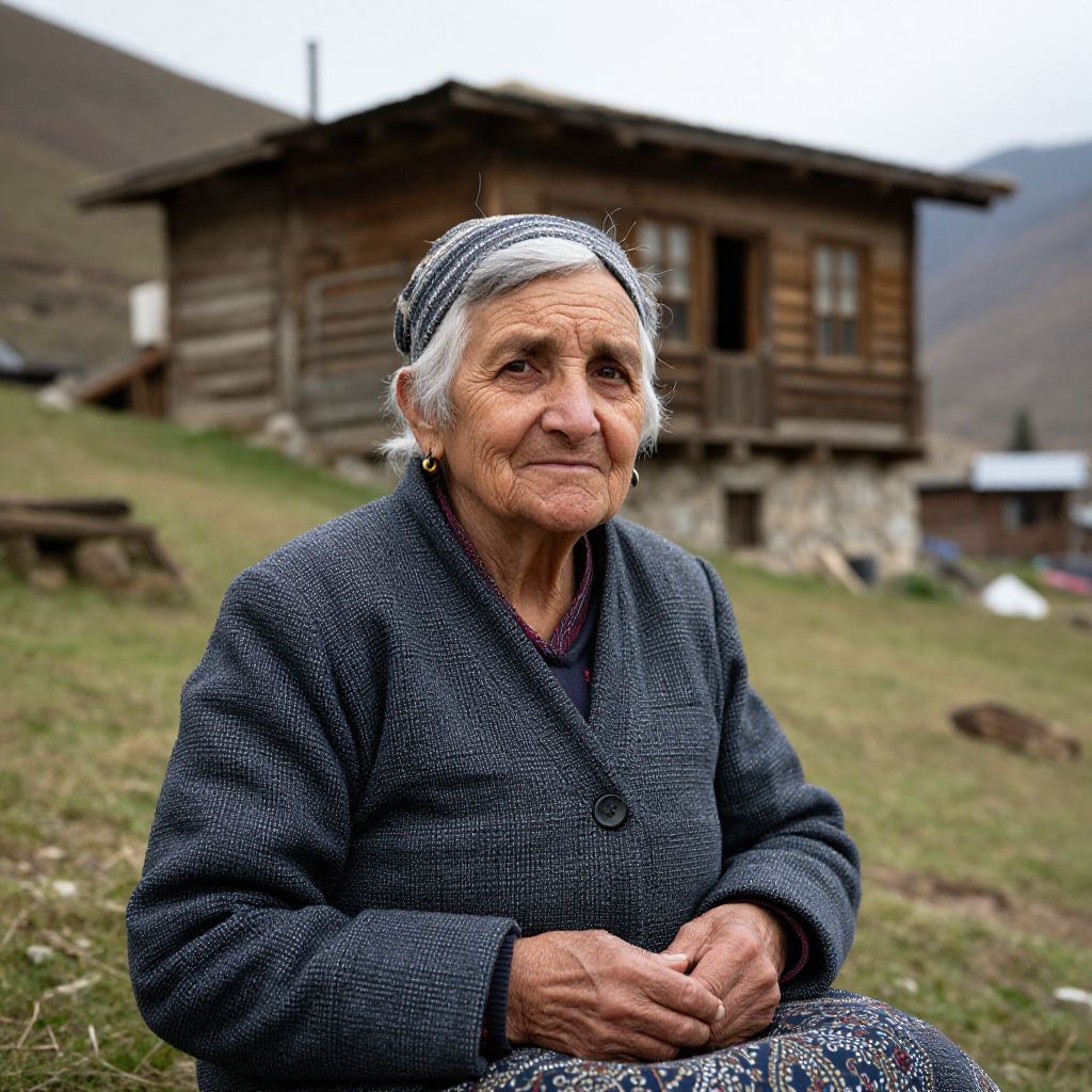 A photograph of an elderly woman with wrinkled skin and white hair, wearing a dark blue, textured woolen coat and a black-and-white headscarf. She sits on grassy ground in front of a rustic wooden house with a stone foundation, set against a blurred background of a hilly landscape. Her hands rest on her lap, and she smiles gently. The house has a small balcony and a sloping roof, with a few indistinct objects scattered nearby. The image has a slight HDR effect, enhancing the colors and details.